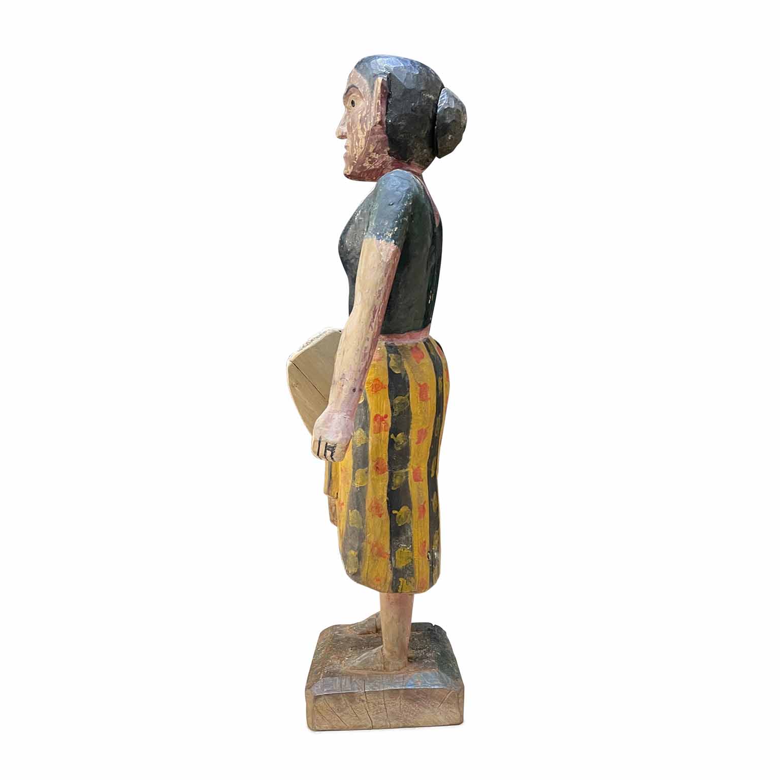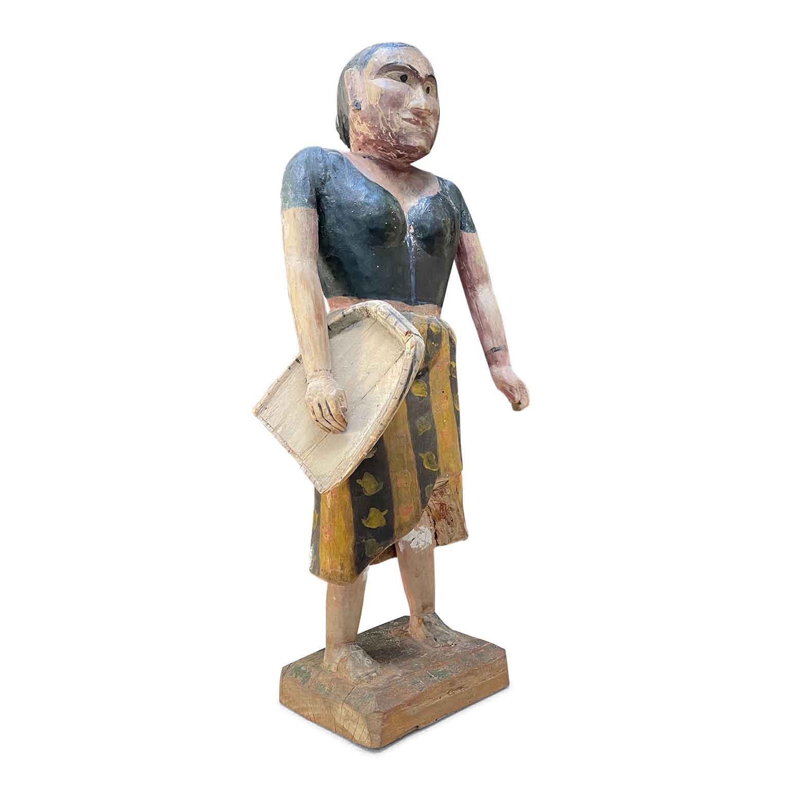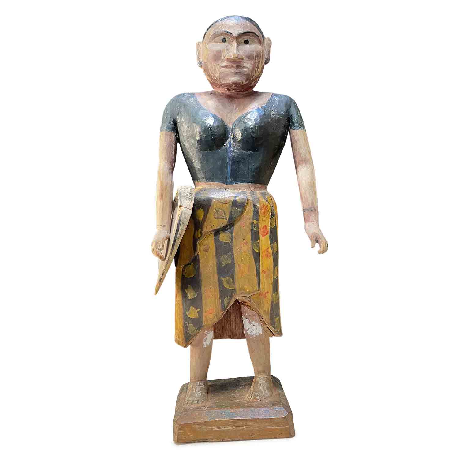 Figura Di Lavandaia Birmana Fine 1800 appoggiata su di una base quadrata vestita con un abito con gonna a righe gialle con fogli regge nella mano destra un asse da lavandaia. La laccatura non ha preparazione e vi sono delle cadute di colore che tuttavia non alterano l’aspetto naif della scultura che ha una resa immediata nella sua semplicità e grossolanità. Proviene dalle raccolte di un viaggiatore milanese ed è in buono stato di conservazione: sono state consolidate le giunzioni delle spalle con il busto ed i piedi con la base.