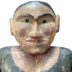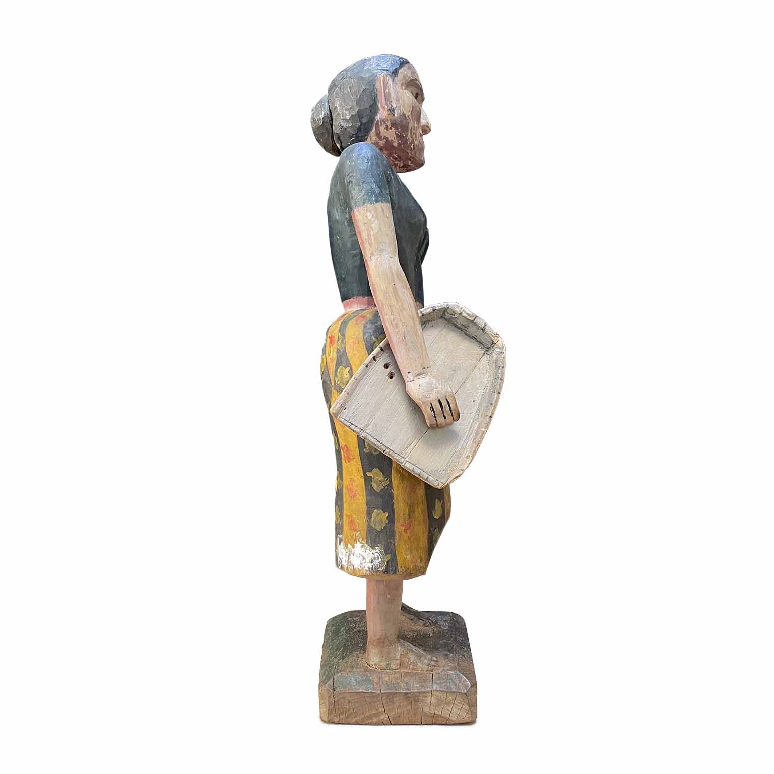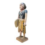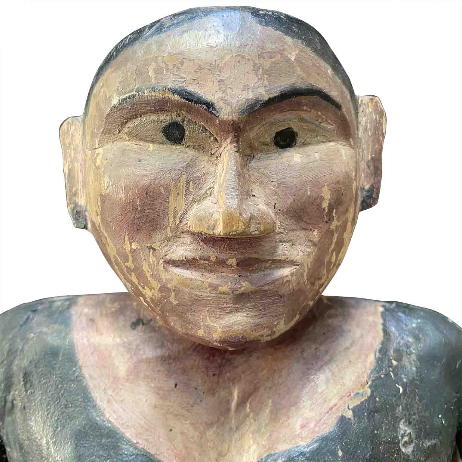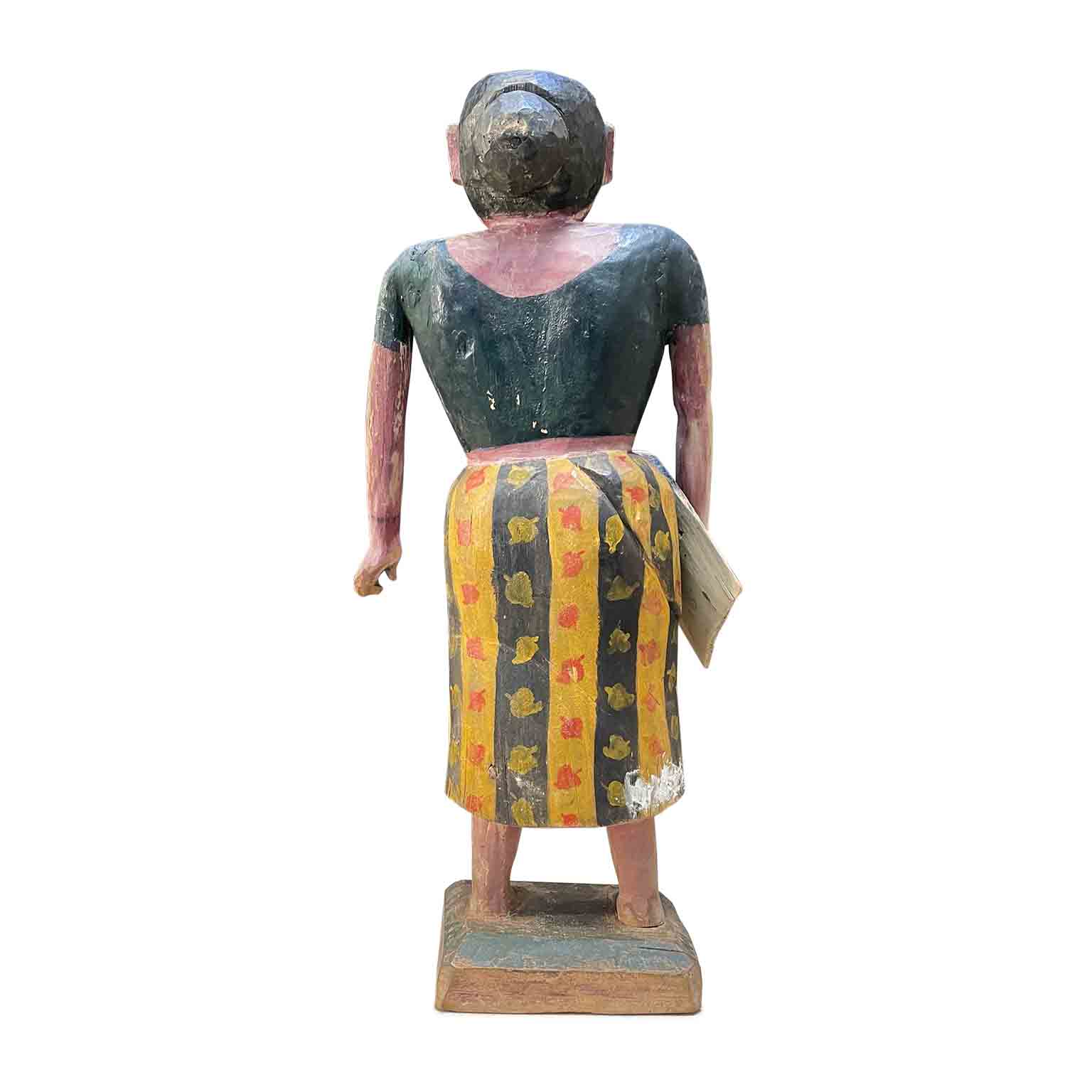 Figura Di Lavandaia Birmana Fine 1800 appoggiata su di una base quadrata vestita con un abito con gonna a righe gialle con fogli regge nella mano destra un asse da lavandaia. La laccatura non ha preparazione e vi sono delle cadute di colore che tuttavia non alterano l’aspetto naif della scultura che ha una resa immediata nella sua semplicità e grossolanità. Proviene dalle raccolte di un viaggiatore milanese ed è in buono stato di conservazione: sono state consolidate le giunzioni delle spalle con il busto ed i piedi con la base.