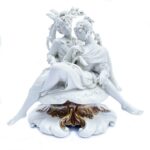 Giuseppe Cappé Scena Amorosa 1960 circa gruppo in porcellana bianca e oro con le figure di due innamorati, una scena galante che raffigura una dama con una rosa in mano, seduta in grembo all’innamorato, con la schiena addossata ad un tronco di albero mentre le accarezza i capelli, in ambito agreste. Il centrotavola in porcellana si presenta in ottimo stato.
