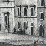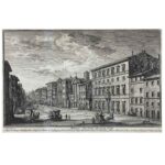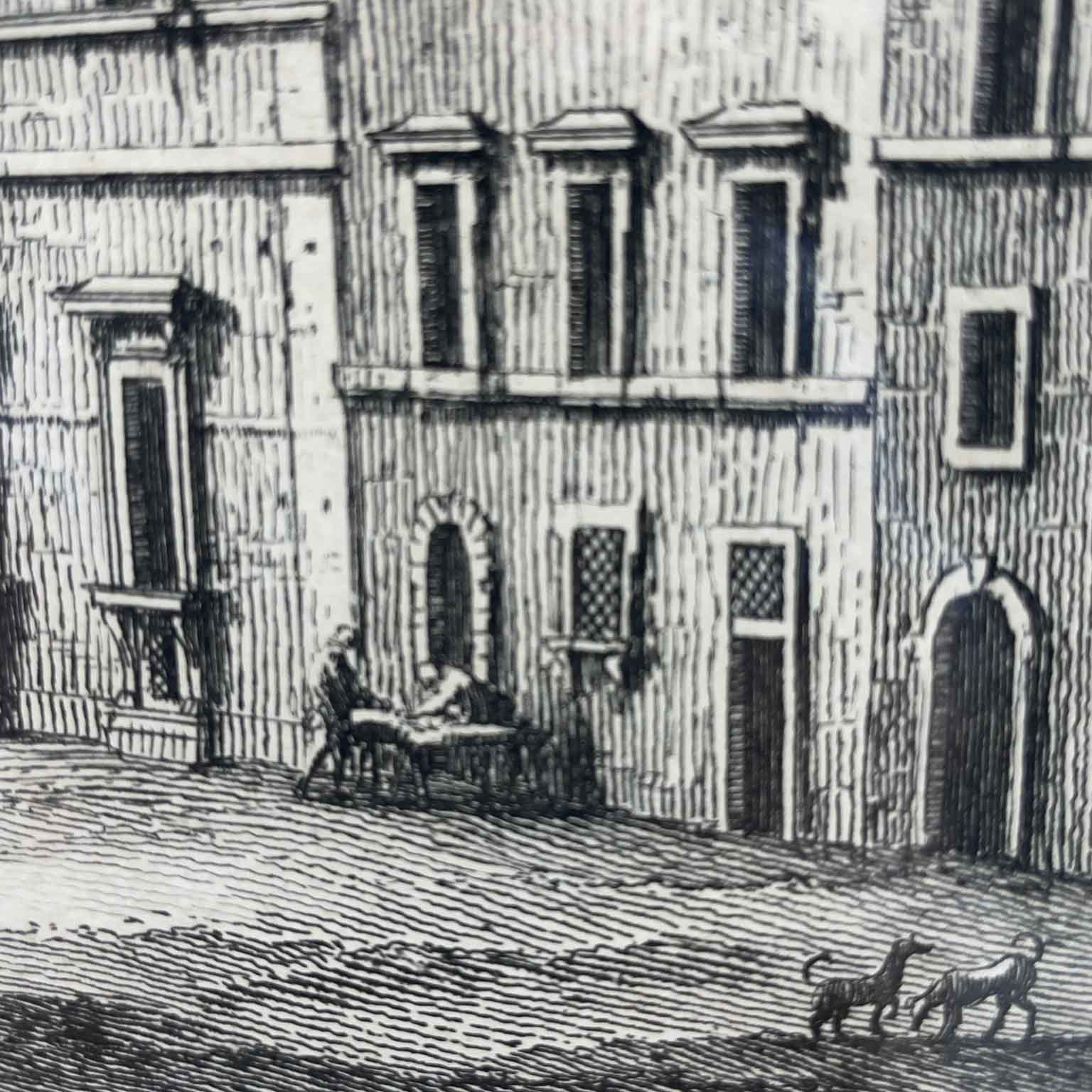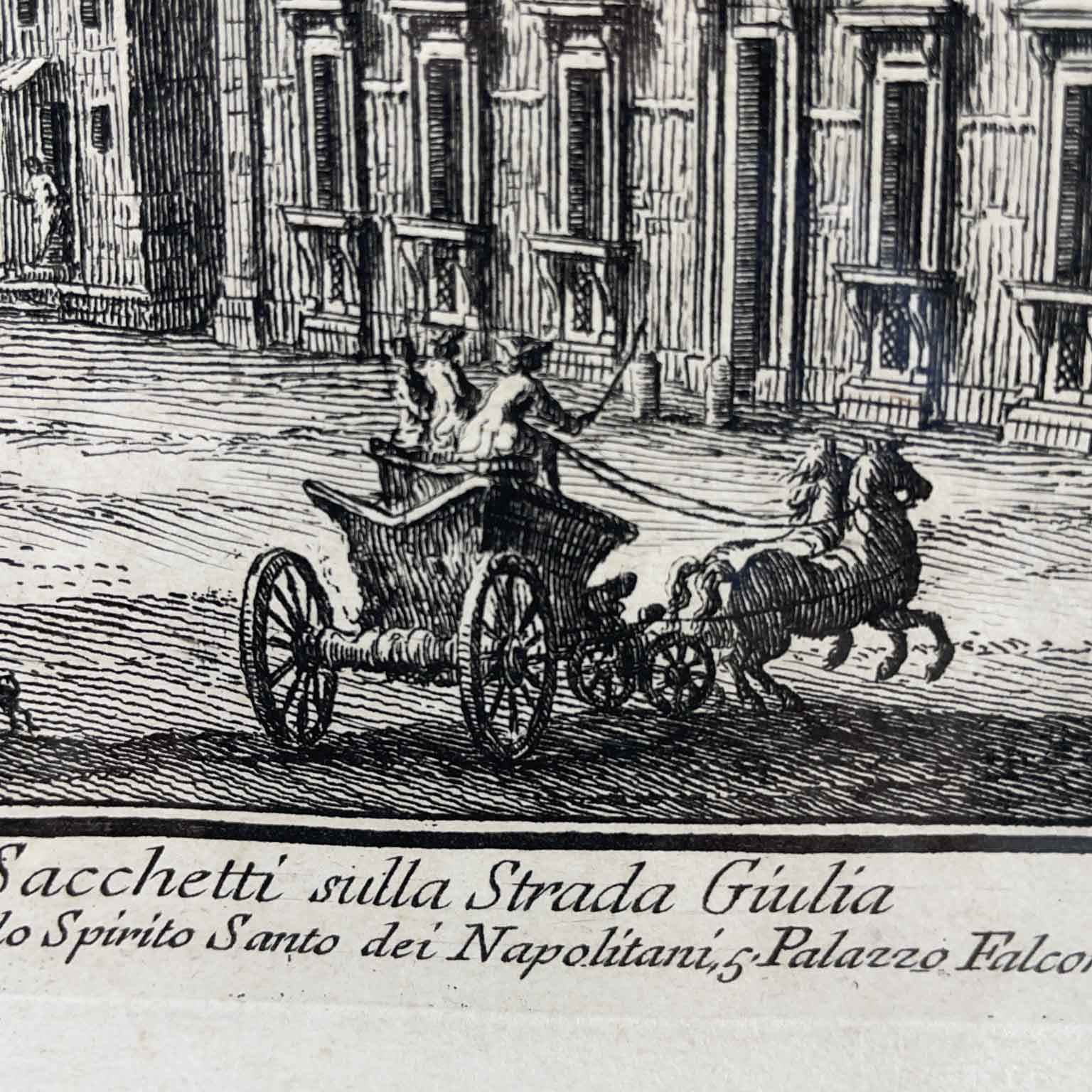 Giuseppe Vasi Palazzo Sacchetti Sulla Strada Giulia veduta disegnata ed incisa da Giuseppe Vasi (1710-1782) che fu uno dei più importanti incisori di veduta nella Roma del diciottesimo secolo e che fu maestro del Piranesi. La veduta è tratta dall’opera monumentale Delle magnificenze di Roma antica e moderna pubblicata in 10 volumi dal 1747 al 1761 composta da 23incisioni in rame con testo narrativo che fornisce informazioni storiche e documentarie. E’ incisa all’acquaforte su carta vergata ed è in buono stato di conservazione. Si presenta entro cornice moderna in legno.