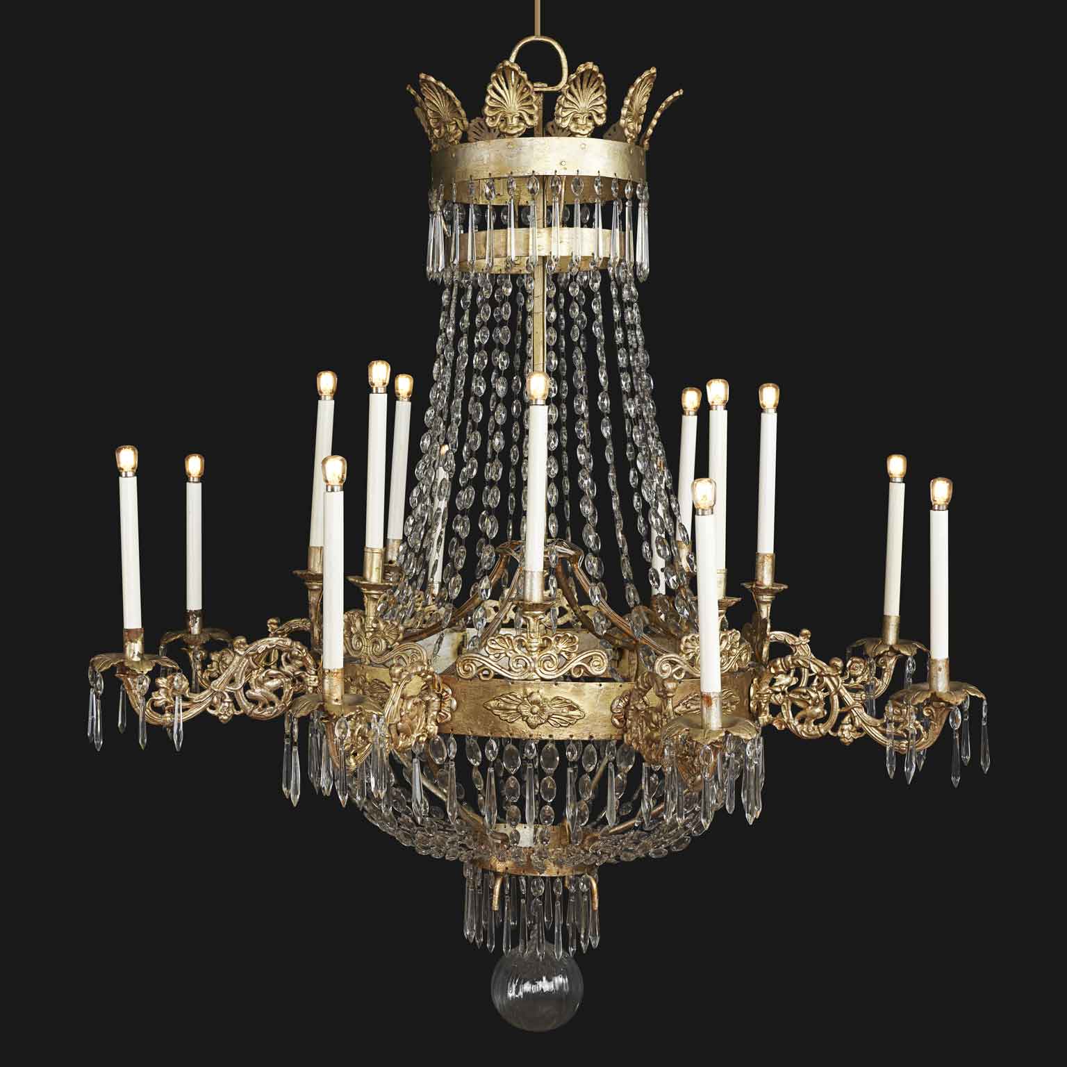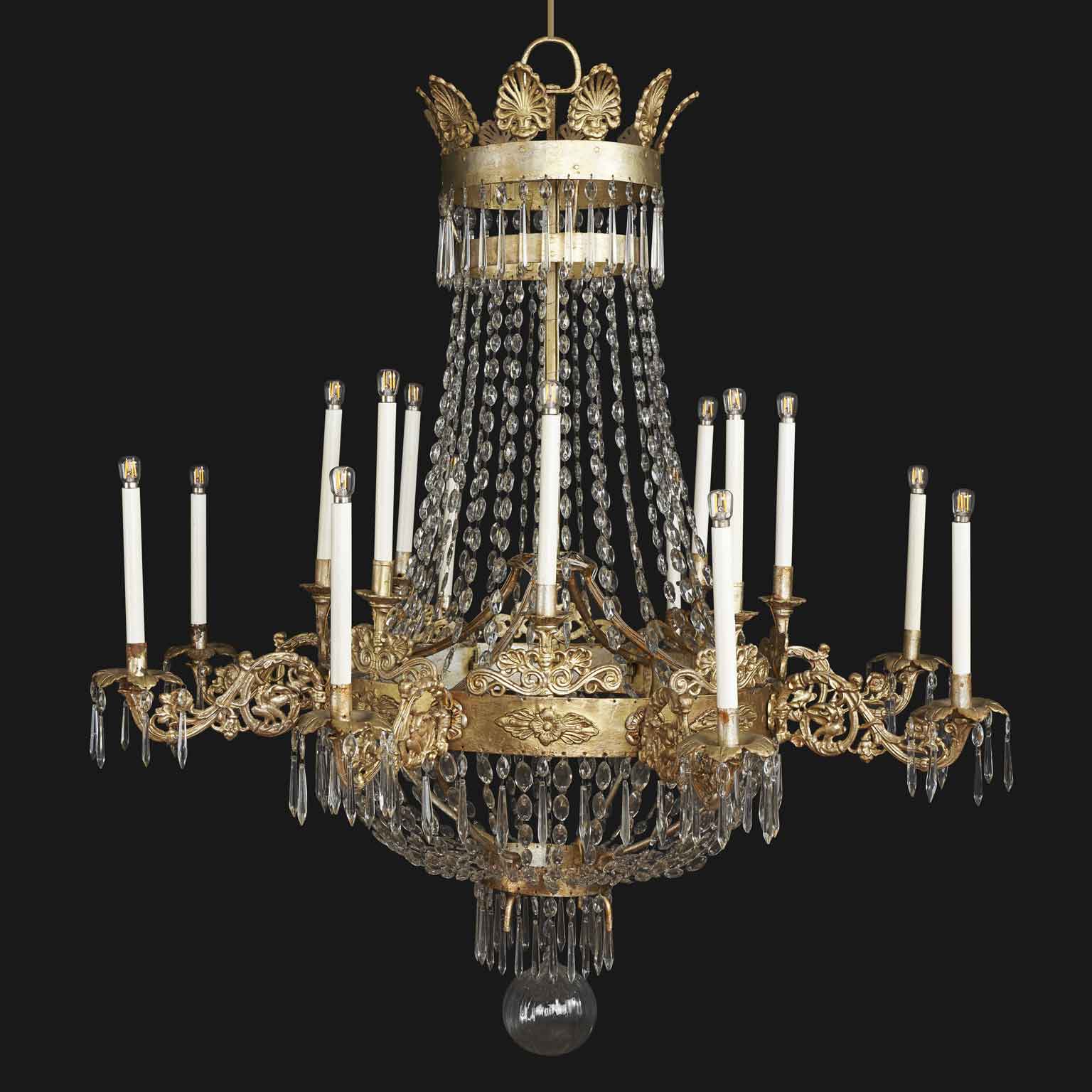 Grande Lampadario Impero Ferro Dorato e Cristallo Sedici Luci 1780 Circa