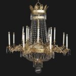 La corona superiore è ornata da fusioni a forma di palmetta ricurva, una cascata di catene e festoni di ovalini in cristallo completano questo elegante lampadario nato alla fine del XVIII secolo per l’illuminazione a candele di ampi saloni.