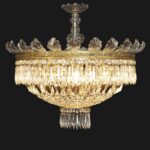 Grande Plafoniera in Cristallo a Cinque Luci Anni Cinquanta racchiuse all’interno di una coppa circolare di cristalli. Questa sospensione circolare di fine anni 50 è caratterizzata nella parte superiore da una corona dorata in bronzo fuso, decorata con volute di racemi in rilievo e sormontata da foglie curve in cristallo. Da questa fascia parte una cascata di cristalli che formano una morbida vestizione di catene di ottagoni in cristallo sfaccettato di misura digradante che si raccorda al centro con una ghiera rotonda in metallo ed altri cristalli a punta, pendenti, prismi in cristallo intagliato con la punta come lance.