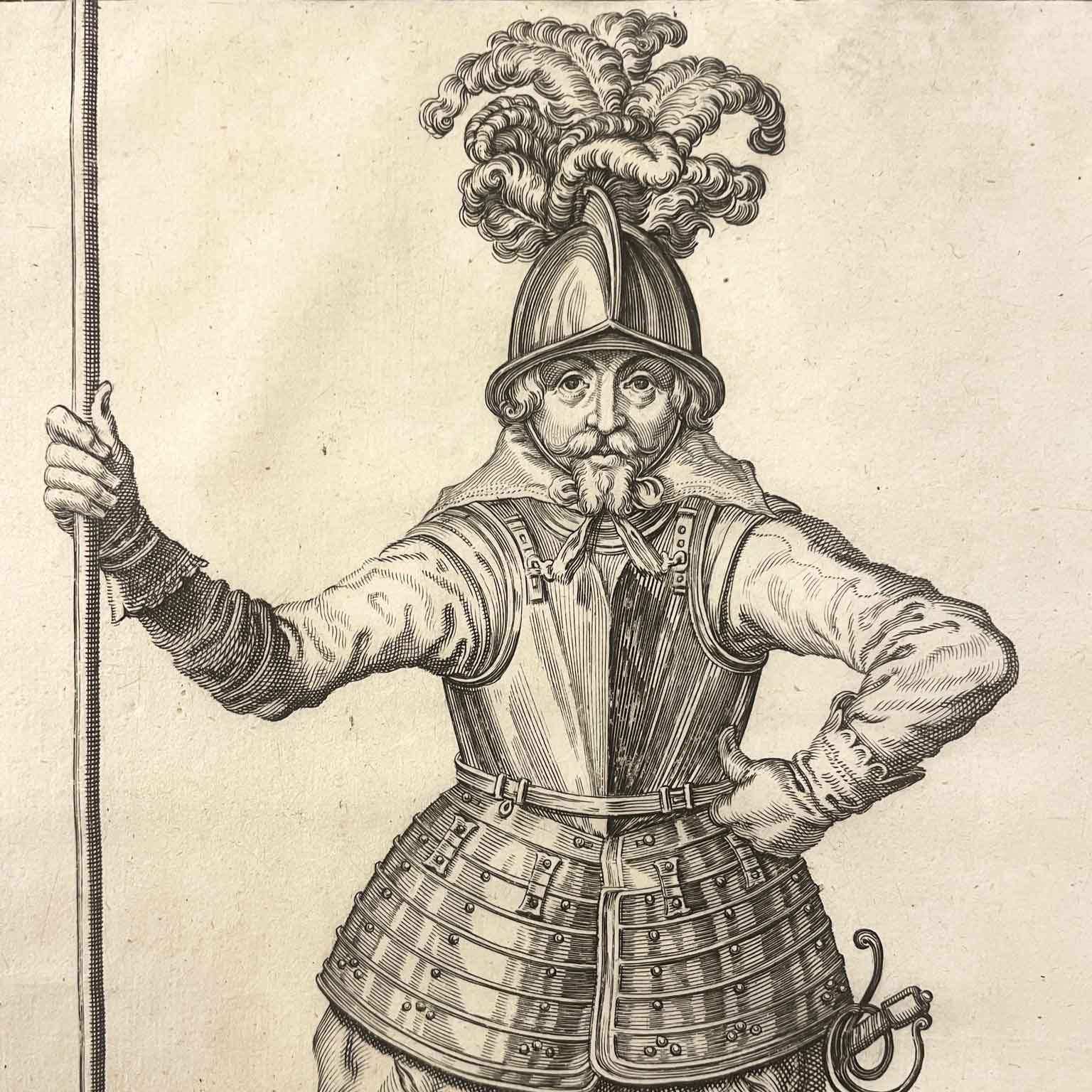 La stampa fa parte dell’opera “Wapenhandelinghe van Roers, Musquetten ende Spiessen“, un manuale che non solo offre istruzioni sull’uso delle armi, ma fungere anche da documento storico in grado di fornire informazioni sui costumi e sulla vita dei soldati di quell’epoca. Le incisioni presenti nel volume illustrano una vasta gamma di figure militari, con particolare attenzione ai dettagli delle uniformi e delle armi, riflettendo l’evoluzione tattica e militare in seguito all’Unione di Utrecht del 1579.