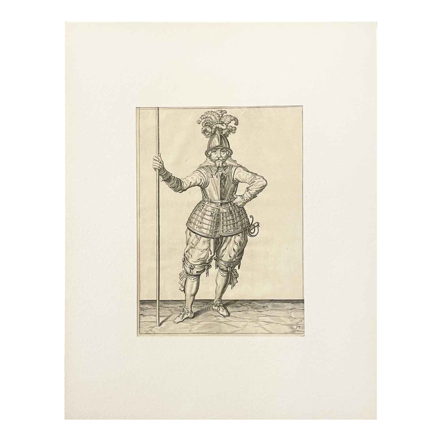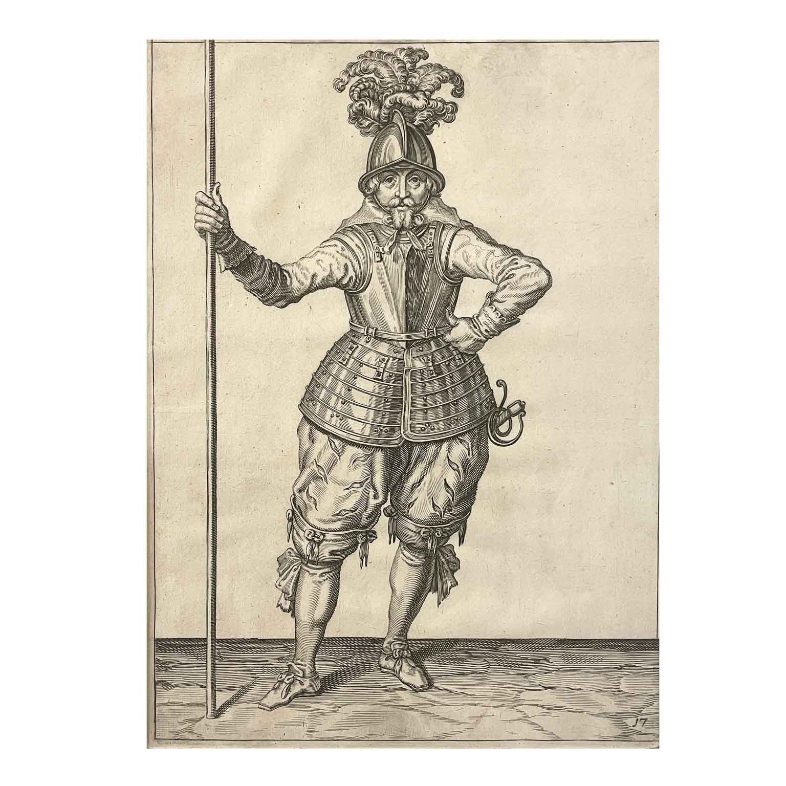L’incisione all’acquaforte di Jacob de Gheyn, raffigurante un soldato in Costume Militare e risalente al 1607, rappresenta un importante esempio dell’arte incisoria del periodo tardo manierista. De Gheyn, uno degli incisori più influenti del suo tempo, ha dedicato gran parte della sua carriera alla rappresentazione di soggetti militari, un tema che era particolarmente rilevante nell’Europa del XVII secolo, caratterizzata da conflitti e guerre.