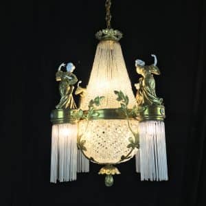 Lampadario Francese Art Nouveau 1910 circa, in Bronzo Dorato con Cristalli e Statuine in Porcellana, in eccellente stato di conservazione.