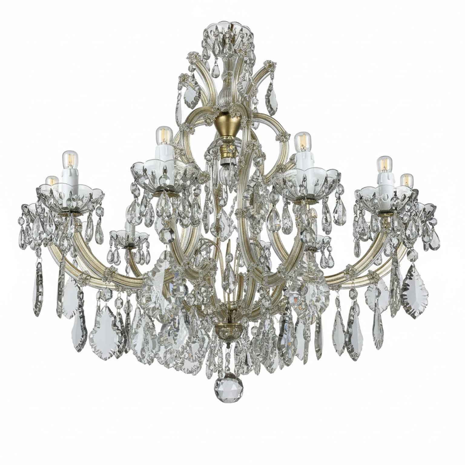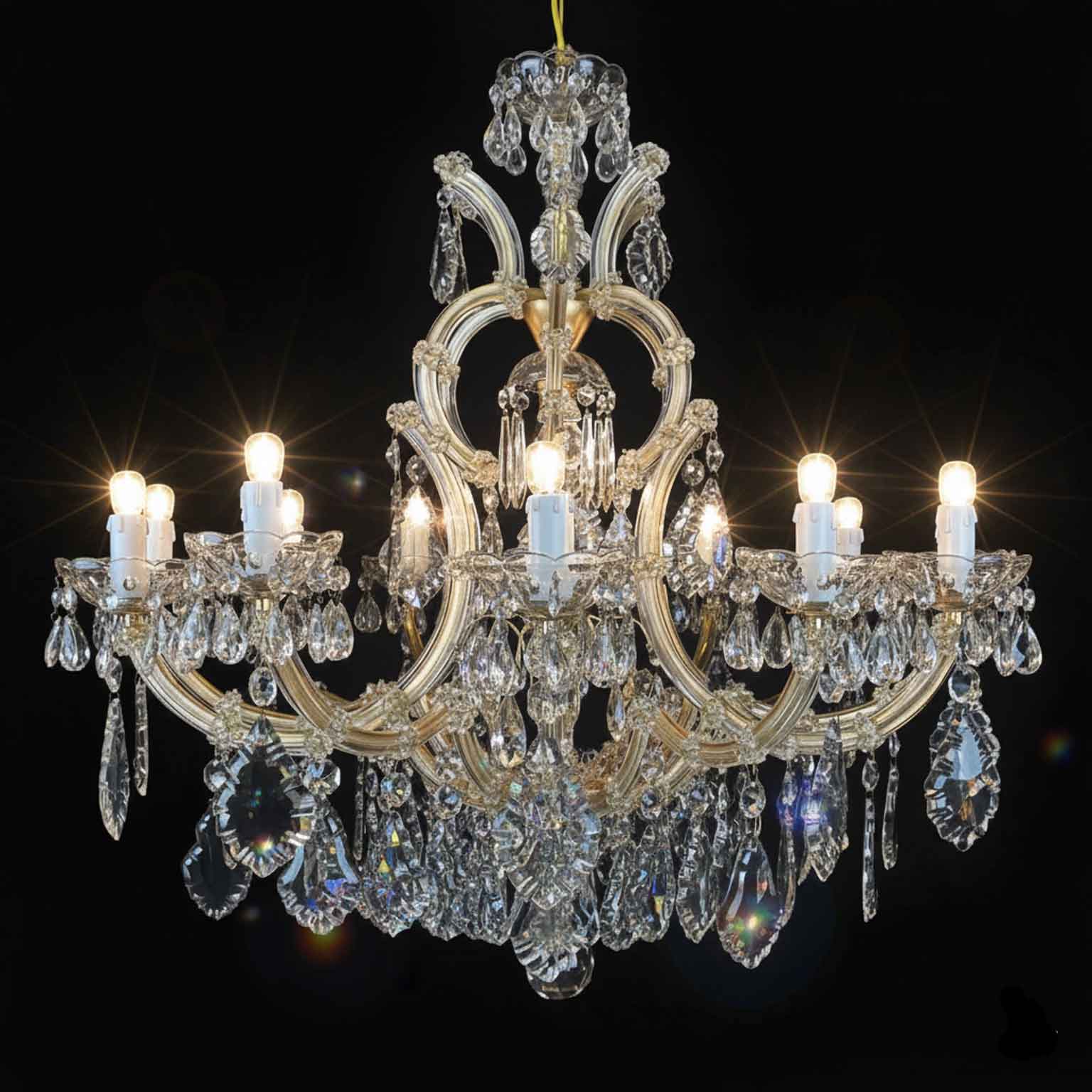 Il lampadario Maria Teresa è caratterizzato da un telaio in metallo impreziosito da un fusto ornamentale in vetro e dodici bracci sporgenti decorati con elementi a forma di goccia realizzati in cristallo, rivestito da cristalli lungo tutta la struttura metallica che è stata ridorata,  decorato da una moltitudine di  gocce di cristallo di varia forma e misura, a ventaglio sagomate e molate, a mandorla, prismi, ottagoni.