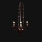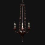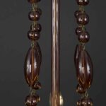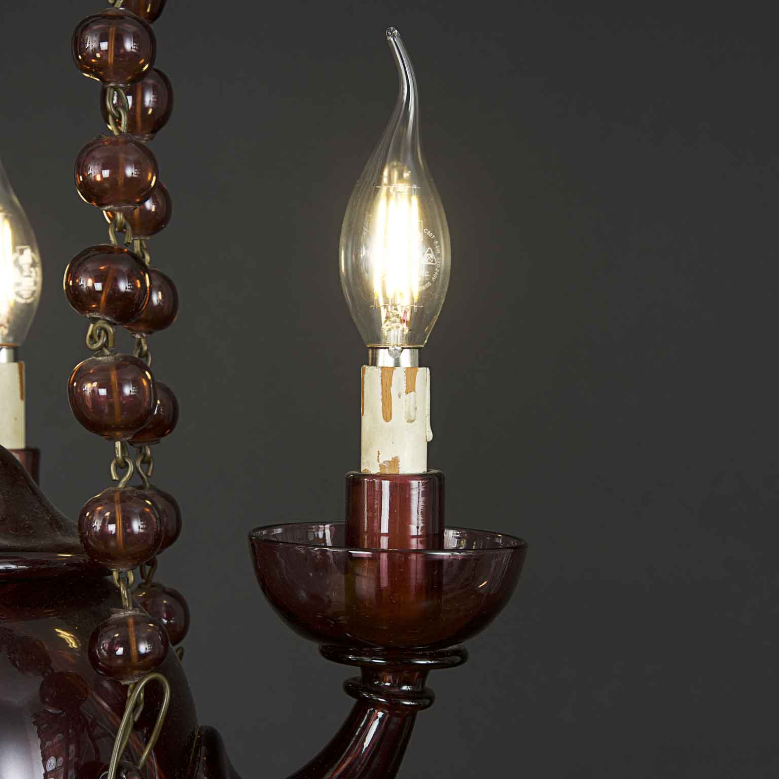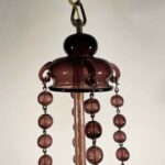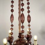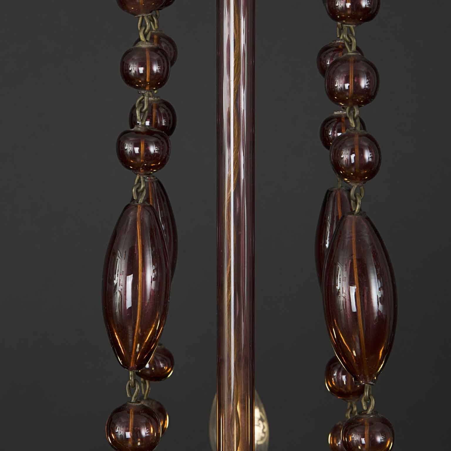 Il lampadario risale agli anni 30 circa ed ha un design molto originale, è un cestello di forma circolare,  la ampolla inferiore terminante con un pendente a goccia è adornata con quattro bracci curvi terminanti con luci rivolte verso l’alto ed è  collegata alla coppa superiore grazie a catene di perle di vetro soffiato, ovali e circolari,  dettagli intricati e lavorati a mano che lo rendono un pezzo unico e prezioso.