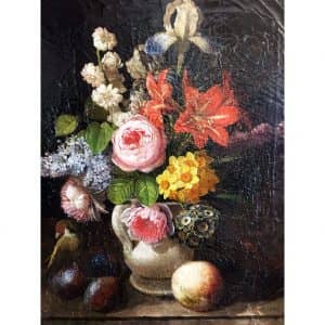 L’opera raffigura un mazzo di fiori policromi, peonie rosa, nasturzi gialli, dalie, lilium rossi, iris raccolti entro una brocca di ceramica bianca posta sopra un tavolo. Sul piano d’appoggio, sul proscenio troviamo una pesca, due prugne e due uccellini. La pittura è fatta di forme nitide e colori splendenti realizzata con una straordinaria definizione dei particolari.