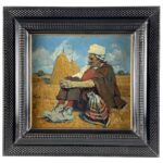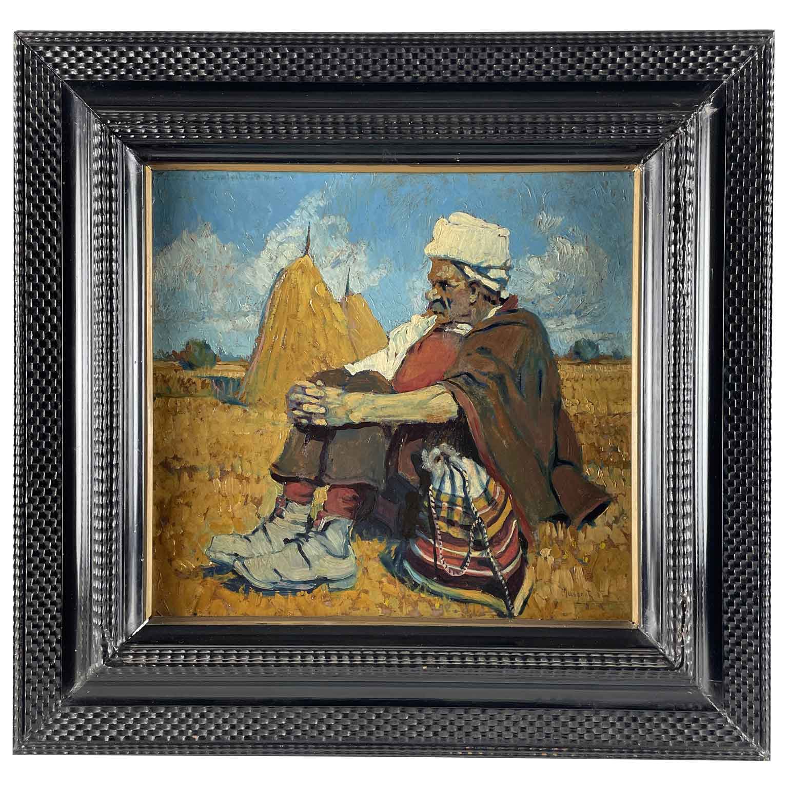 Mazalik Doko 1922 Uomo Seduto In Un Campo Con Covoni, in questa originale opera della Bosnia Erzegovina Doko MAZALIC cattura una scena di riposo nel mezzo di un campo dove un uomo, un contadino o un viandante, è seduto in posizione di riposo in primo piano, con due grandi covoni di fieno ed un paesaggio rurale sullo sfondo. I colori dominanti sono le sfumature dorate del fieno e del campo, l’azzurro del cielo con ampie nuvole ed i toni caldi dell’abbigliamento della figura maschile seduta, con le mani che cingono le ginocchia, vestita con abiti semplici, un copricapo, una giacca sulle spalle ed un sacchetto di stoffa variopinta. La composizione del dipinto è semplice e trasmette un senso di pace e immobilità. Questo momento di riposo è reso dal pittore con una pennellata rapida e vibrante che conferisce all’opera un senso di vitalità e di forza anche nella rappresentazione della staticità di un momento di quiete.