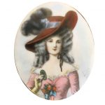 Miniatura di Donna con cappello dalla tesa larga con piume ed un vestito di color rosa con le spalle scoperte. La miniatura ha una forma ovale ed è inserita tramite delle cornici in bronzo dorato ed un pass par tout entro una cornice rettangolo ottagonale in bronzo. Ha una firma non leggibile. In buono stato, risale alla metà del 1900.