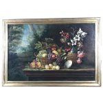 Natura Morta di Fiori e Frutta appoggiata sul piano di un tavolo la composizione è formata da un canestro di paglia intrecciata pieno di frutta e da un fiasco di vetro con paglia contenente dei fiori. Sullo sfondo un paesaggio. Ha una cornice dorata incisa nei centri e negli angoli con dei motivi fogliacei. Il dipinto è decorativo ma non antico, realizzato intorno agli anni Ottanta, ed è in buono stato di conservazione.