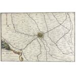 Nicolas De Fer Les Environs De Milan 1705 Incisione in rame. Mappa raffigurante i dintorni di Milano con le mura difensive della città, arricchita da cartiglio decorativo riportante il titolo. Ottimo stato di conservazione. Mappa dell’Italia nordoccidentale e delle zone limitrofe a Svizzera e Francia, pubblicata per la prima volta da Nicolas De Fer nel 1696. La mappa si estende da Milano alla costa genovese, al Lago di Como e ai Grigioni a est fino alle regioni di Nizza, Savoia, Lione e Lago di Ginevra a ovest. La parte sinistra del foglio è quasi interamente occupata da un grande cartiglio, con in alto il titolo e la dedica al Delfino, e in basso un riquadro dedicato a “Les Valles de Perouse, De Pragelas, De St. Margtin, D’Angrogne e di Lucerne”. In basso a destra la firma di Jacqueline Panouse una delle poche donne ad aver inciso mappe, rare quindi le tavole ascrivibili a lei. Nicolas de Fer (1646-1720) geografo ufficiale dei re francesi e spagnoli è stato uno dei geografi e cartografi francesi più prolifici e influenti della fine del XVII e dell’inizio del XVIII secolo.