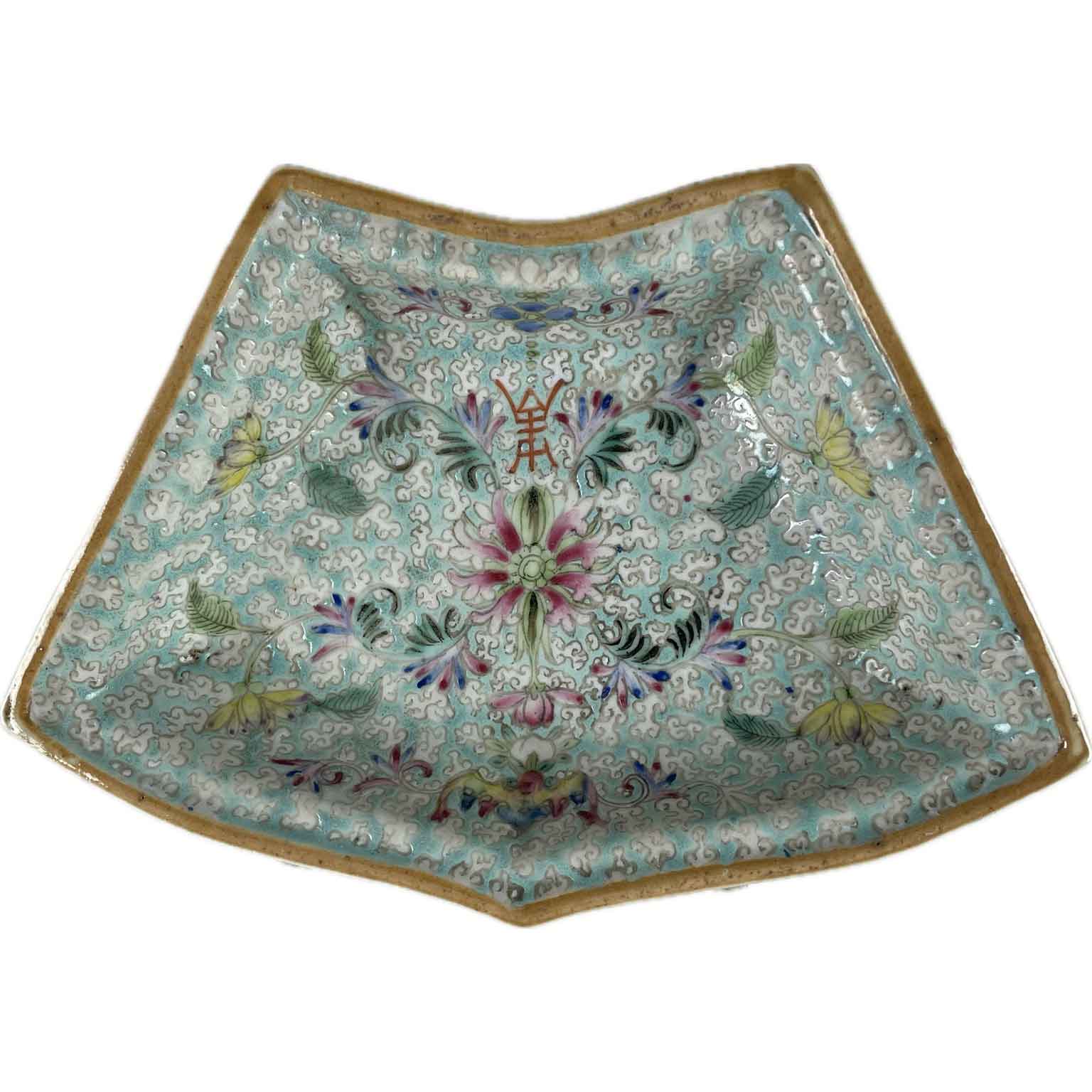 La tesa ha il bordo polilobato e leggermente rialzato, dipinto in ocra; la decorazione di questo vassoietto sagomato è particolarmente accurata, su fondo verde chiaro, con una campitura fitta formata da nuvolette bianche. Il cavetto del piatto è ornato da una raffinata decorazione floreale policroma.