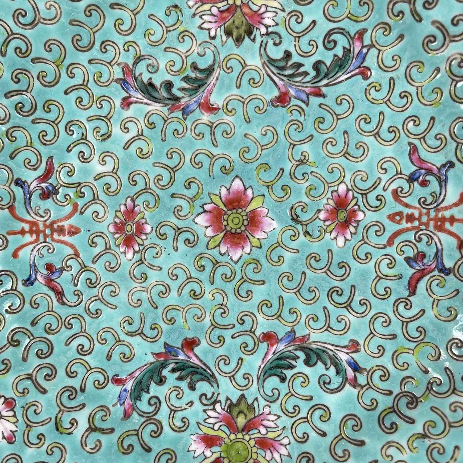 Piatto Cinese A Fondo Verde In Porcellana Riccamente Decorato di tipologia piana con una fitta trama di decorazioni a ricciolo color giallo dai quali emergono un fiore centrale ed altri quattro più esterni raccordati da fogliami ed ideogrammi. Come documentato dalle foto i fiori nei toni del rosa hanno delle sfumature meravigliose. Ha delle minime cadute di colore sul bordo ed una  felure sul bordo come visibile nel retro dove al centro troviamo degli ideogrammi in rosso. Cina, seconda metà del 1800.