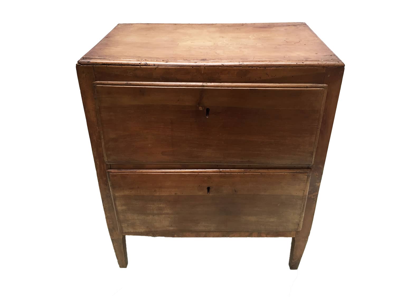 Piccolo Cassettone Luigi XVI in Noce proveniente dall’Italia Centrale, con due ampi cassetti, una chiave e serrature funzionanti; il piano è realizzato con un’asse unica con le cornici sui bordi ricavate direttamente nel massello. Anche i fianchi sono in una sola tavola di noce. Le gambe sono tronco piramidali, è globalmente in buono stato di conservazione, compatibilmente con la datazione di fine Settecento.