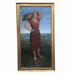 R.G. Battaini, La vendemmia, 1923. Questo grande dipinto ad olio su tela rappresenta il ritratto a figura intera di una giovane donna con abiti agresti, a piedi scalzi con un recipiente pieno d’uva sulla spalla: la ragazza guarda serena verso il cielo mentre sembra intenta a cantare. Sullo sfondo, c’è un paesaggio collinare con uno specchio d’acqua con altre tre figure in procinto di lavorare sotto un bel cielo sereno; non è chiaro esattamente cosa facciano così come non è chiara la lettura del paesaggio che sembra quasi lunare. Il dipinto di grande formato ha una cornice coeva e si presenta in buono stato di conservazione a prescindere dalla necessità di consolidamento nella parte centrale del panneggio della gonna come documentato dalle fotografie, si evidenziano anche diverse “toppe” nel retro della tela ad indicare dei piccoli tagli di entità trascurabile. Il dipinto è firmato e datato in basso a destra R.G. Battaini 923.