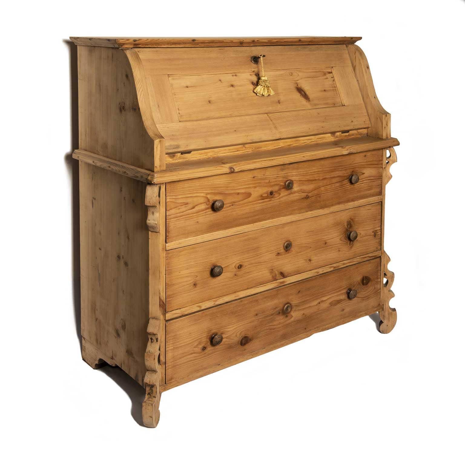 Ribalta in larice della seconda metà del 1800. Cassettone a ribalta in massello di larice a tre ampi cassetti sormontati da una calatoia che cela un vano centrale e sette cassetti. Profili modanati, sui fianchi sono applicati fregi curvi angolari (in origine ebanizzati).