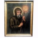 Ritratto di San Francesco da Paola appoggiato ad un bastone terminante con l’iscrizione Charitas. Santo della Carità, fondatore dell’Ordine dei Minimi e protettore delle genti di mare, veneratissimo nel Sud Italia, ma presente in molti luoghi di culto in tutto il paese.