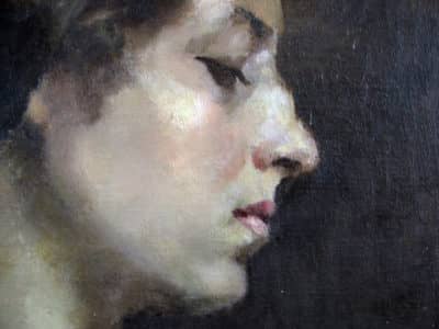 La tela ha un formato quadrato coperto dalla circonferenza del passe-partout dorato della cornice lignea. Colpisce in modo particolare la qualità del dipinto espressa attraverso l'incredibile sensualità del soggetto evocata dallo sguardo sommesso di questa giovane donna ritratta di profilo, con lunghi capelli castani raccolti sulla nuca e ampio décolleté.