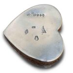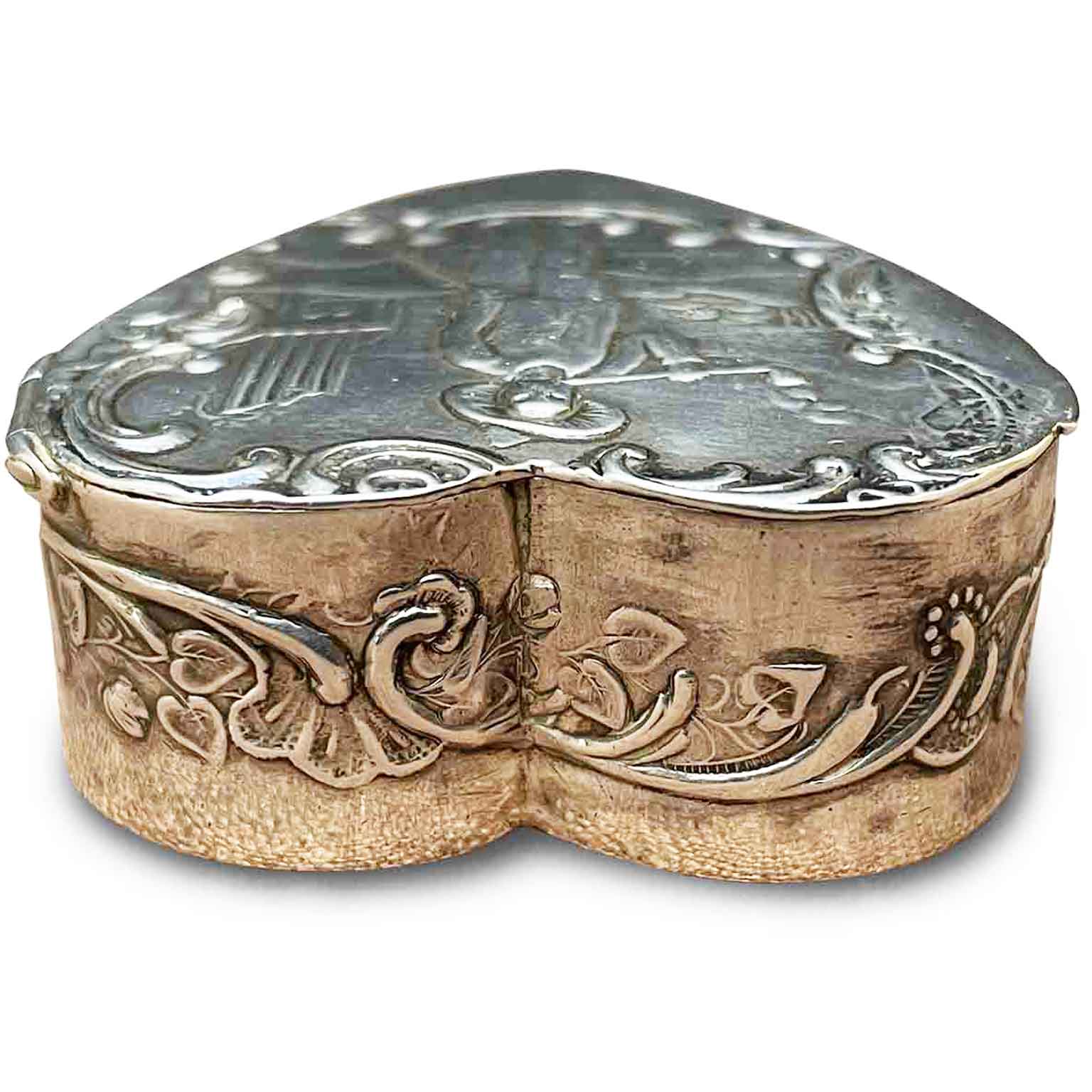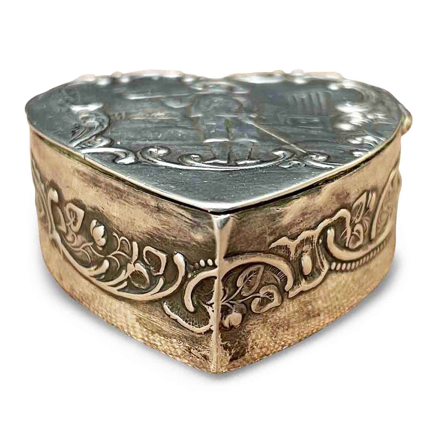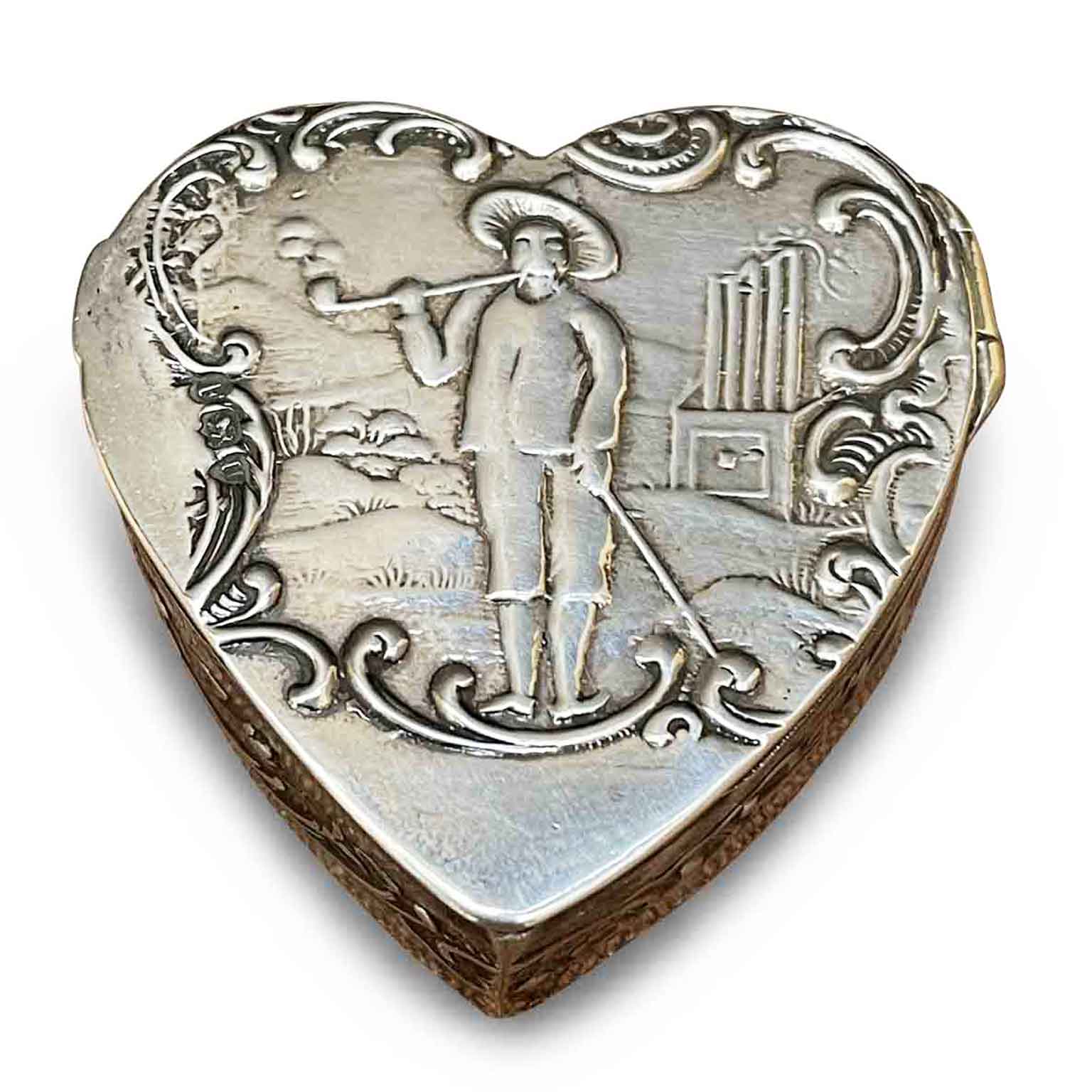 Scatola Argento A Forma Di Cuore Londra 1895-96 decorata sul coperchio con un paesaggio sbalzato con personaggio astante in primo piano con lunga pipa e cappello. Il coperchio si apre tramite una cerniera laterale. Il bordo è decorato da tralci di racemi sbalzati. Il retro di questa antica scatola ottocentesca in argento reca inciso un doppio ciclo di punzonatura nel quale identifichiamo l’argentiere WM a Londra nel 1895/96 per i titolo di argento di 925/000.