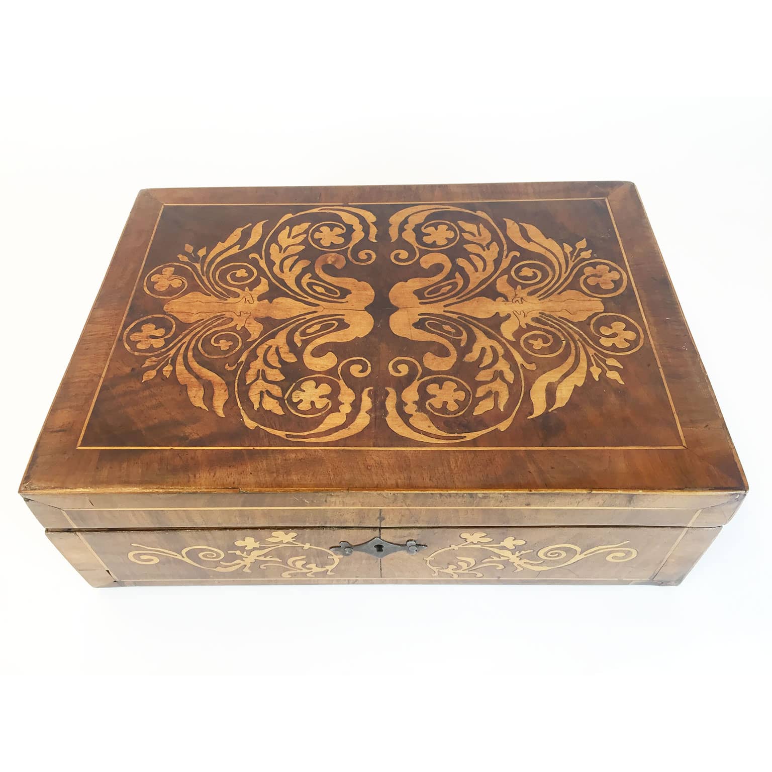 Scatola portagioie in radica filettata ed intarsiata degli inizi del 1900, lastronata su tutti i lati con intarsi floreali sul coperchio e sui maggiori. L’interno è foderato in carta Varese. La scatola è in ottimo stato, lucidata a gomma lacca. E’ dotata di serratura a incasso con una bocchetta in lamierino di ferro sagomato ma manca la chiave.