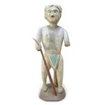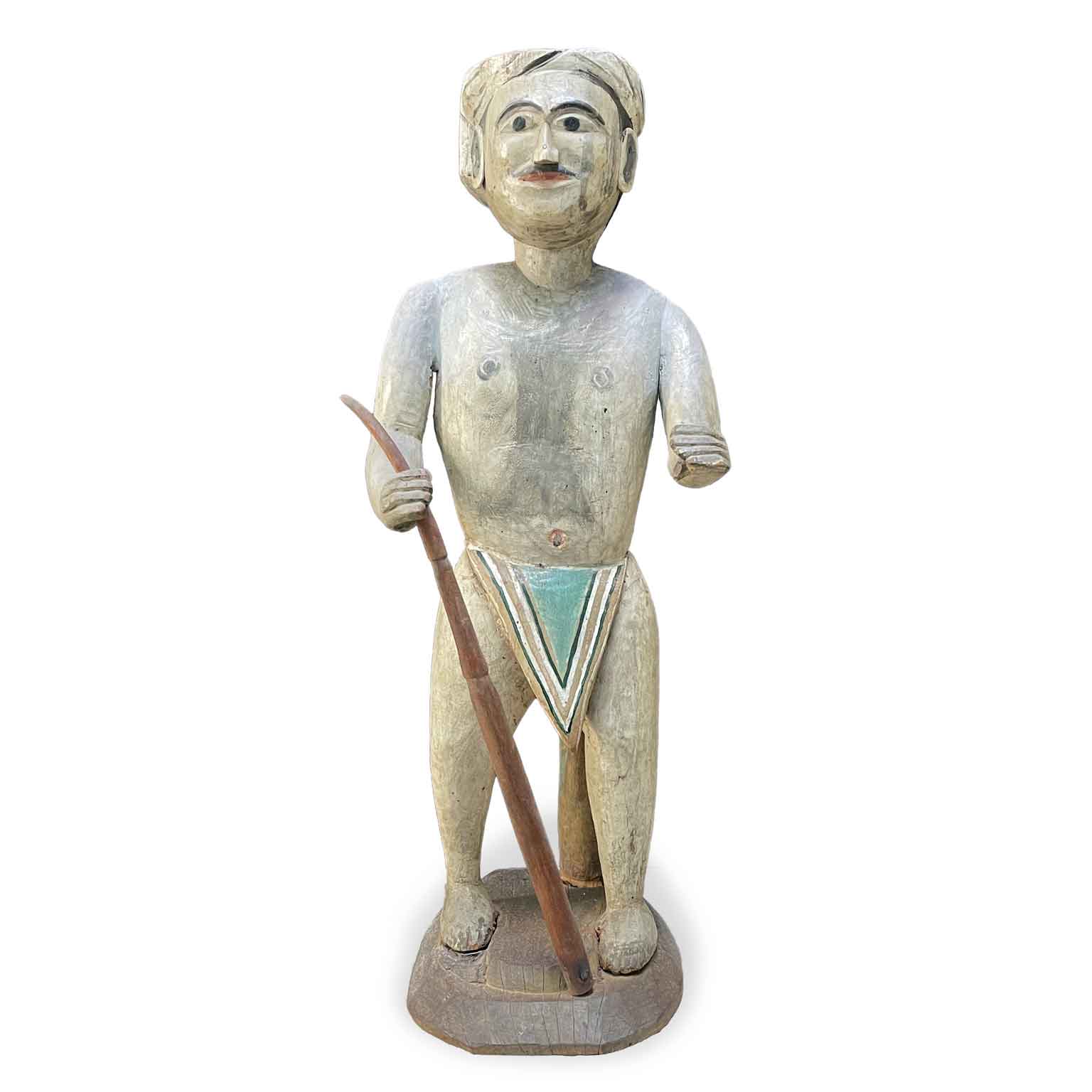 Scultura Maschile Birmana In Legno Dipinto Mandalay Fine 1800 raffigurante un uomo astante con bastone, con perizoma e copricapo dall’aspetto sereno. Poggia sulla base ovoidalale di un albero, il cui tronco supporta la schiena della scultura. Decorato nei toni grigio verde ha una fattura naif e grossolana anche nella resa anatomica, che ciononostante rende questa scultura orientale piacevole e domestica. Birmania fine 1800 in buono stato di conservazione; sono state consolidate  e ritoccate solamente le giunzioni delle spalle con il busto.