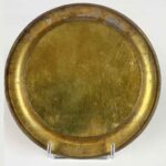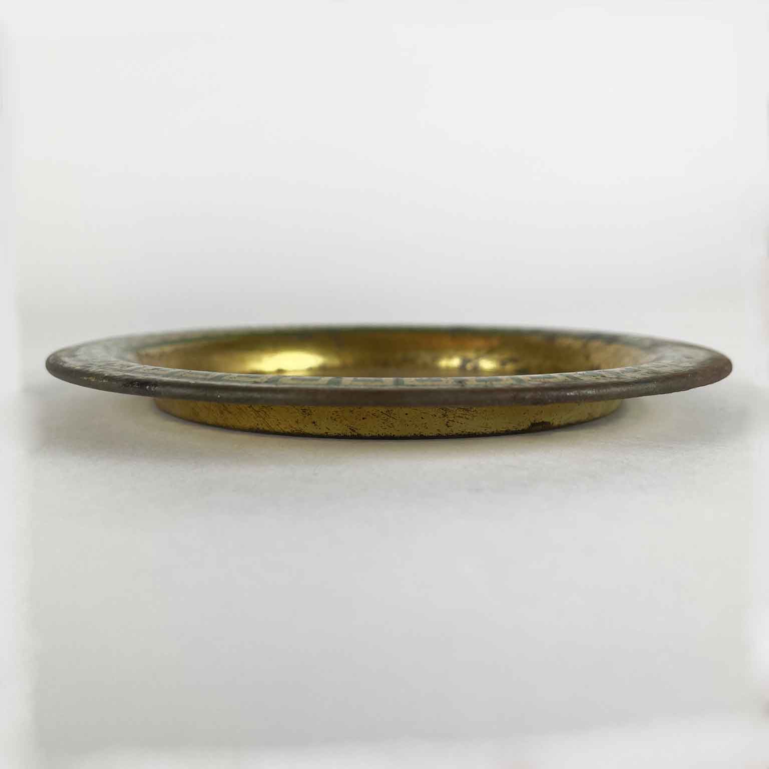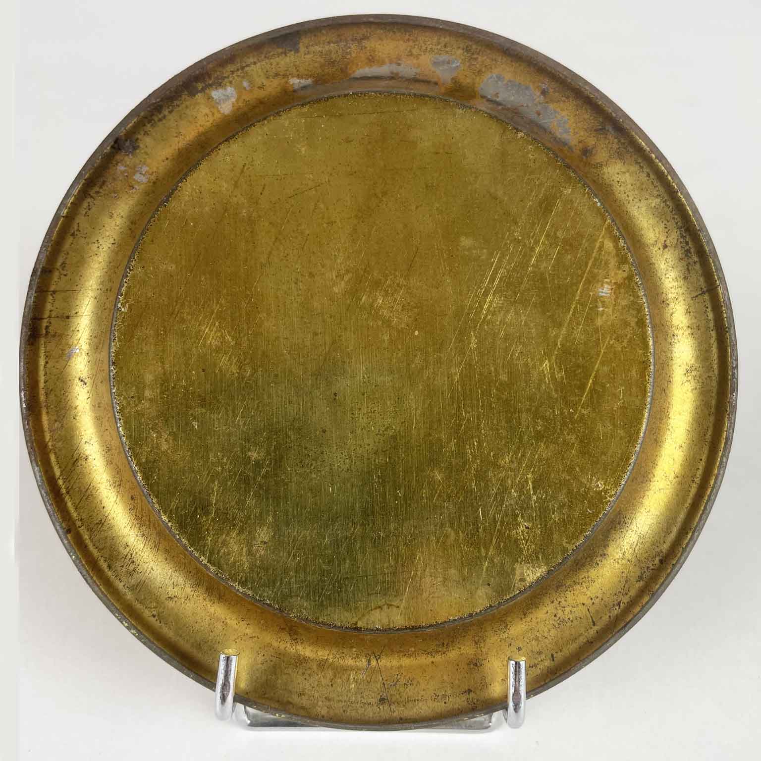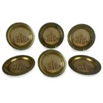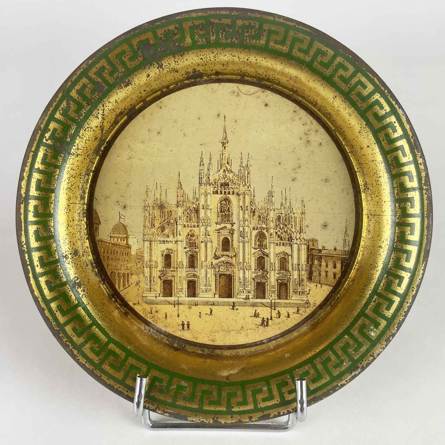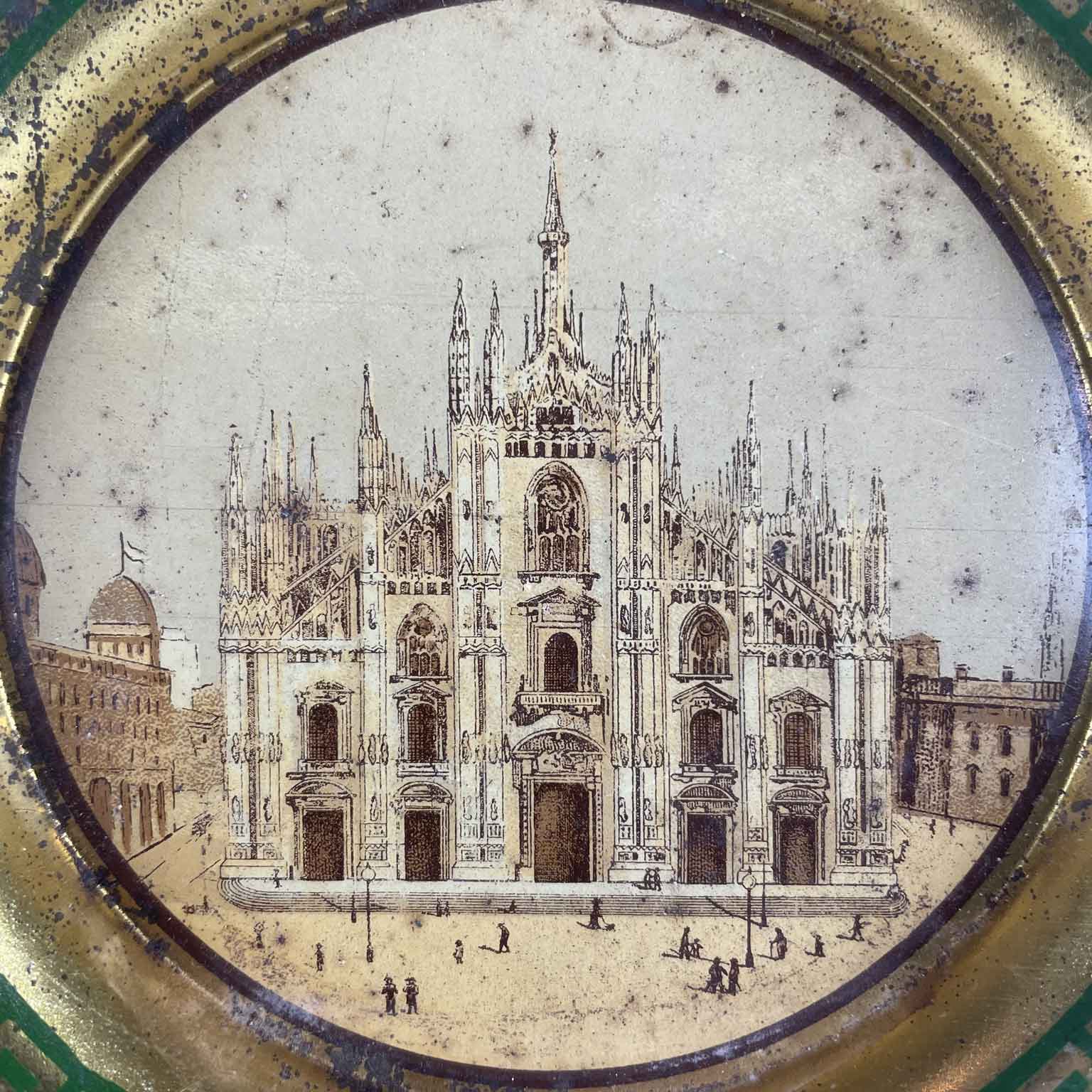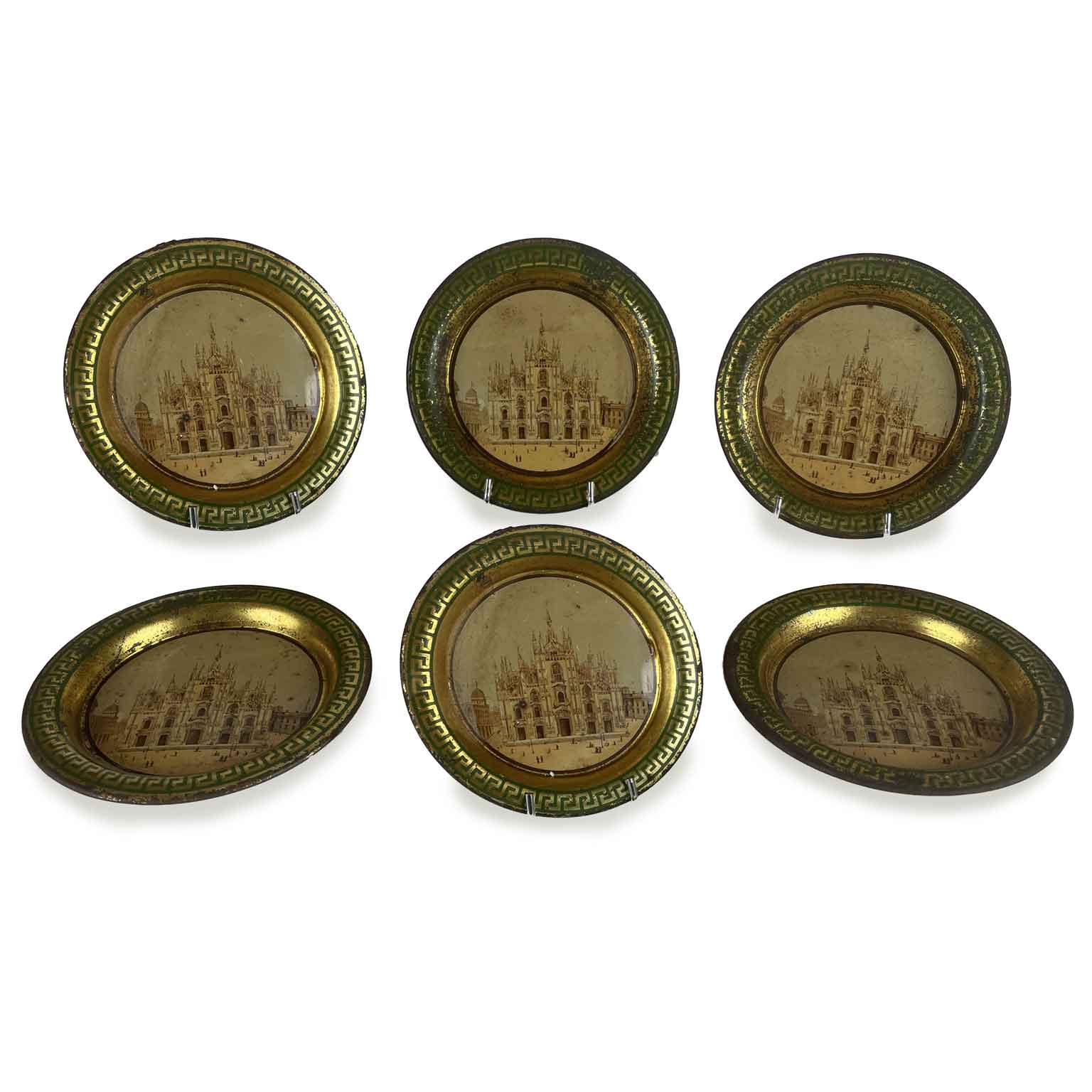 Sei Sottobicchieri del 1800 Con Litografie del Duomo dorati di forma circolare con una greca color verde sul bordo. Al centro la vista frontale del Duomo di Milano con parte della piazza animata di personaggi. In buono stato a prescindere da minimi segni di ossidazione.