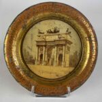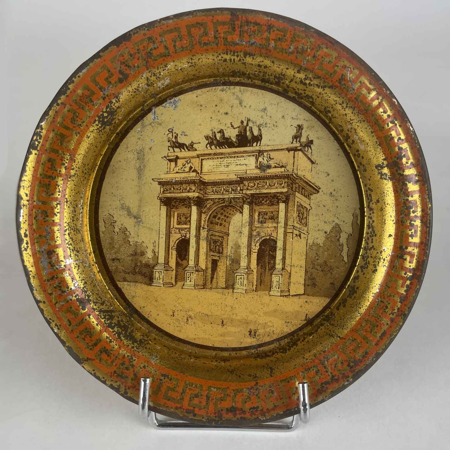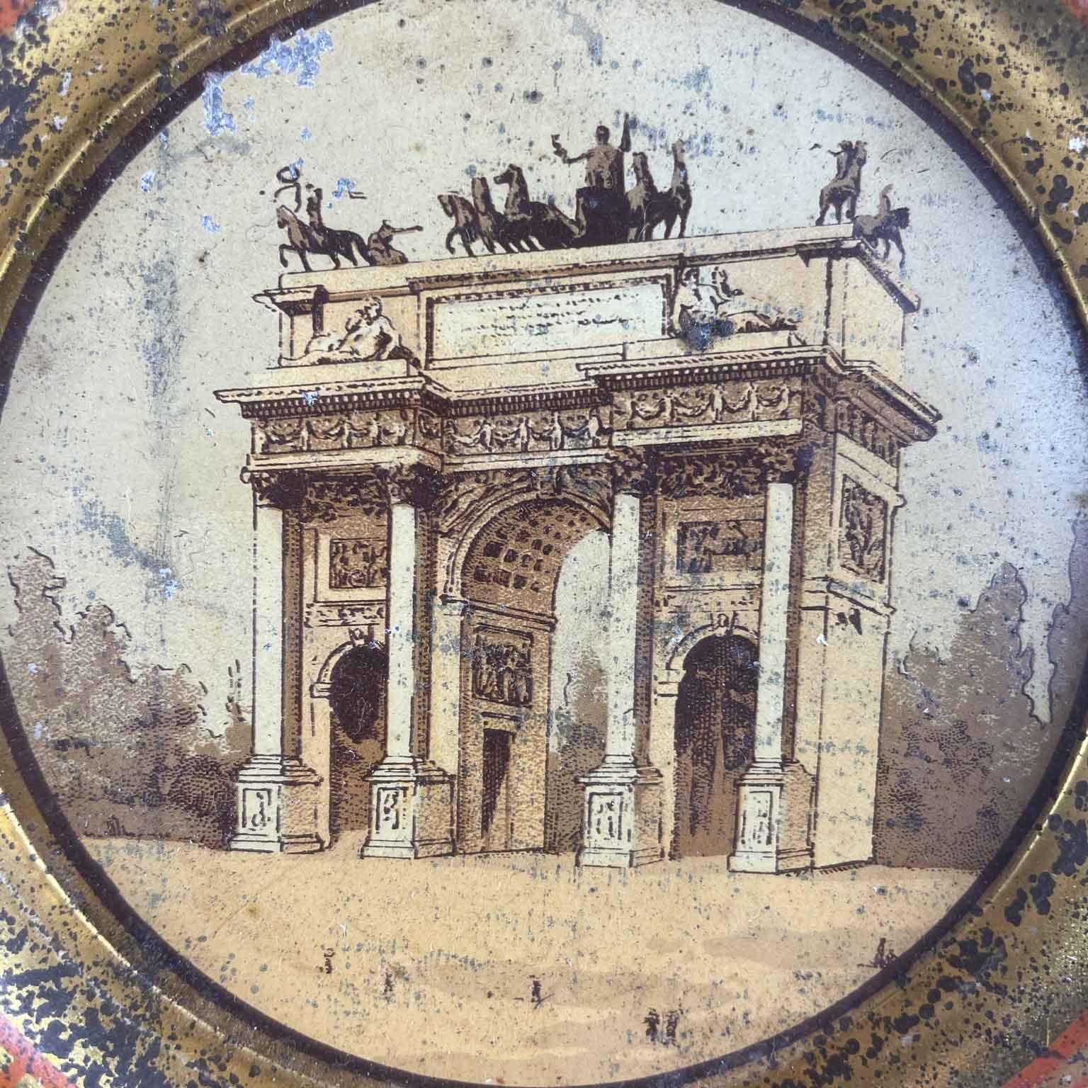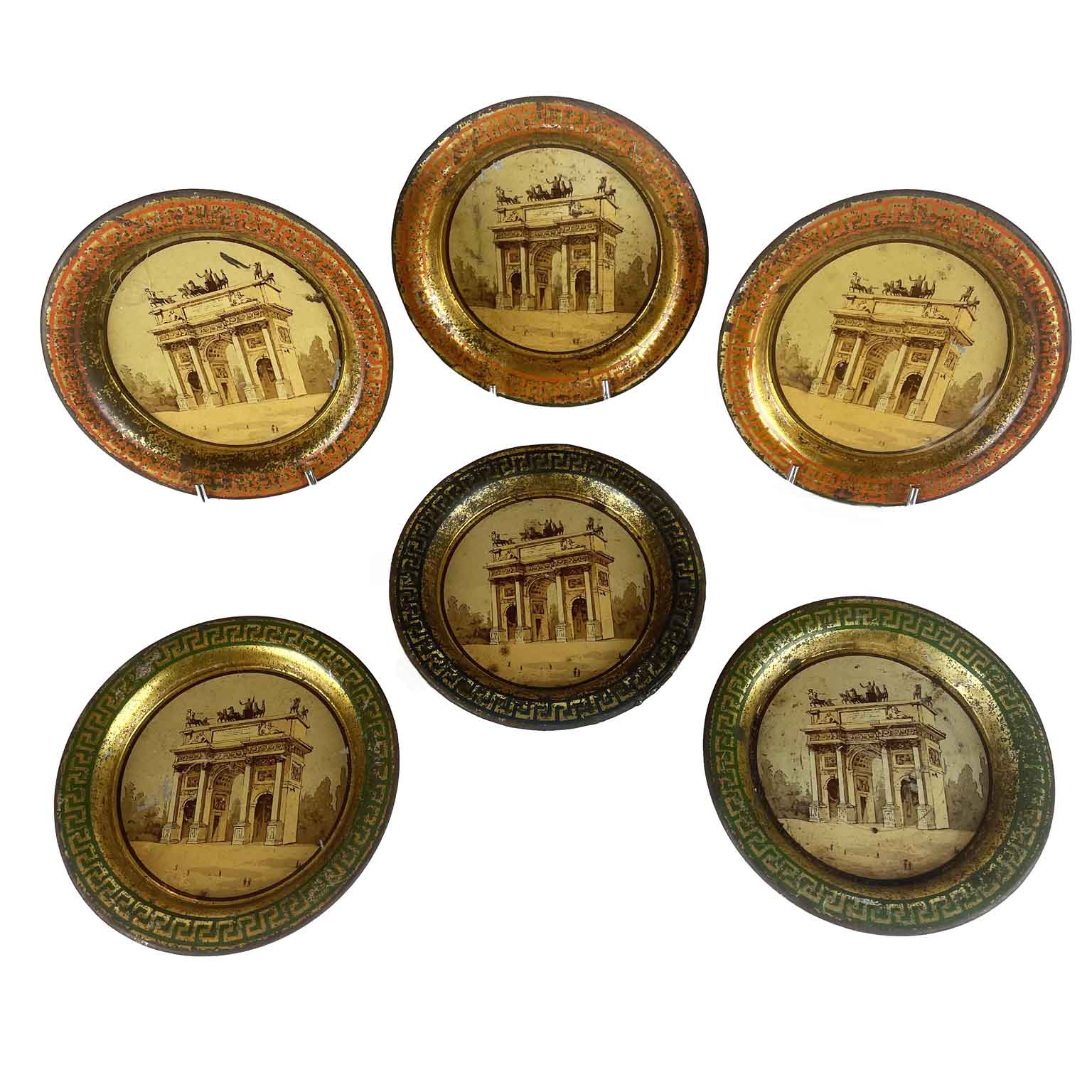 Sei Sottobicchieri Del 1800 Con Litografie Dell’Arco Della Pace dorati di forma circolare con una greca color rosso, verde e nera sul bordo. Al centro la vista frontale dell’Arco della Pace di Milano. In buono stato a prescindere da minimi segni di ossidazione.