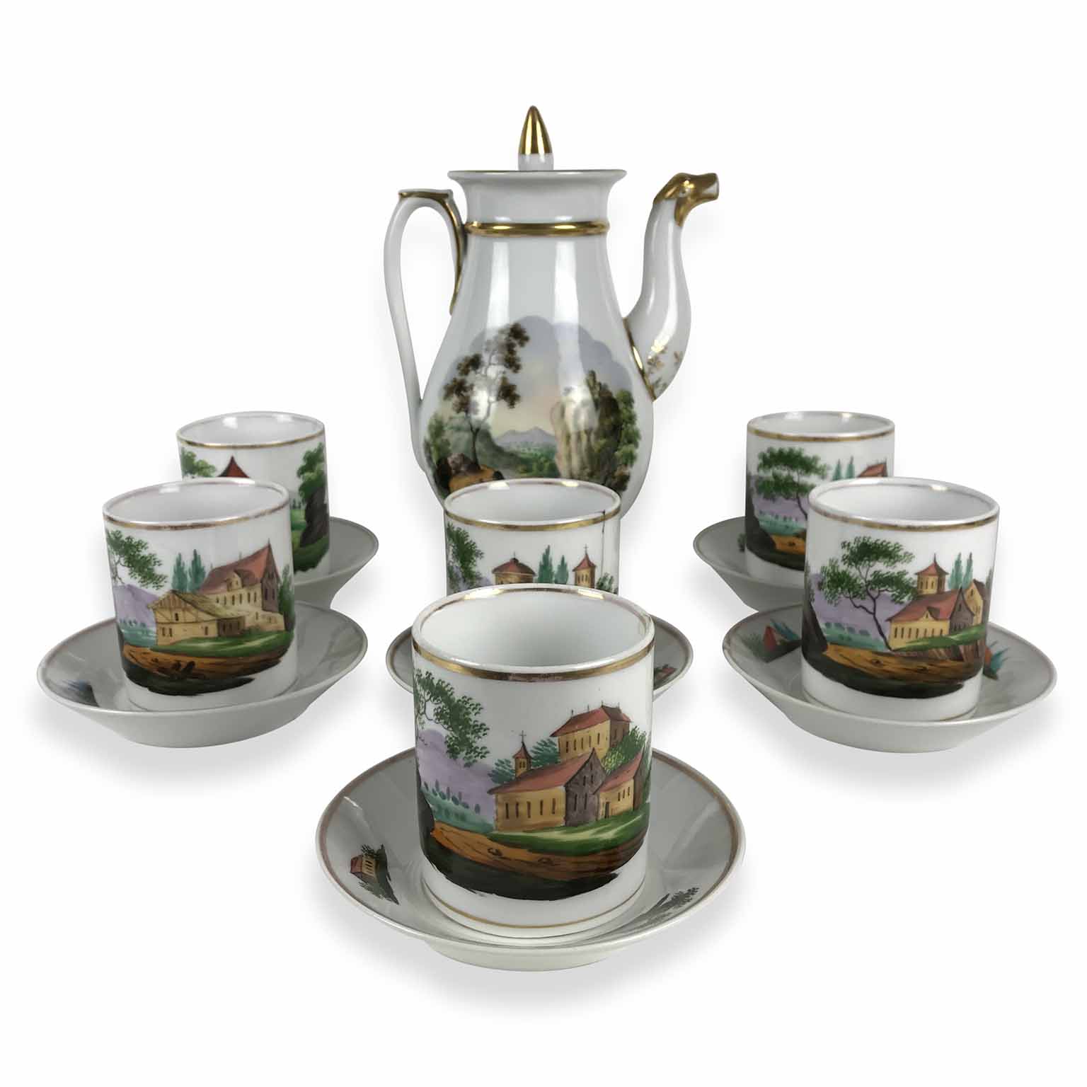 Servizio da Thé in Porcellana Decorata 1800 composto da una grande teiera e sei tazze con relativi piattini. La teiera ha i profili dorati e due grandi tableaux con paesaggi dipinti a mano; il tappo ha tre piccoli tableaux che rimandano ai decori delle tazze ed il pomolo della presa dorato per metà. Il becco del versatoio ha una testa zooomorfa decorata in oro e dei raffinati ramages sempre in oro. Le tazze di forma cilindrica sono profilate in oro nelle estremità e nel manico e presentano paesaggi campestri del Nord con architetture. Il piattino, bordato in oro, richiama queste decorazioni in tre piccoli tableaux. Non presentano nessun marchio sottostante, se non dei numeri in alcune di esse. Attualmente in restauro per ritoccare qualche piccola “felure” su alcune tazze.