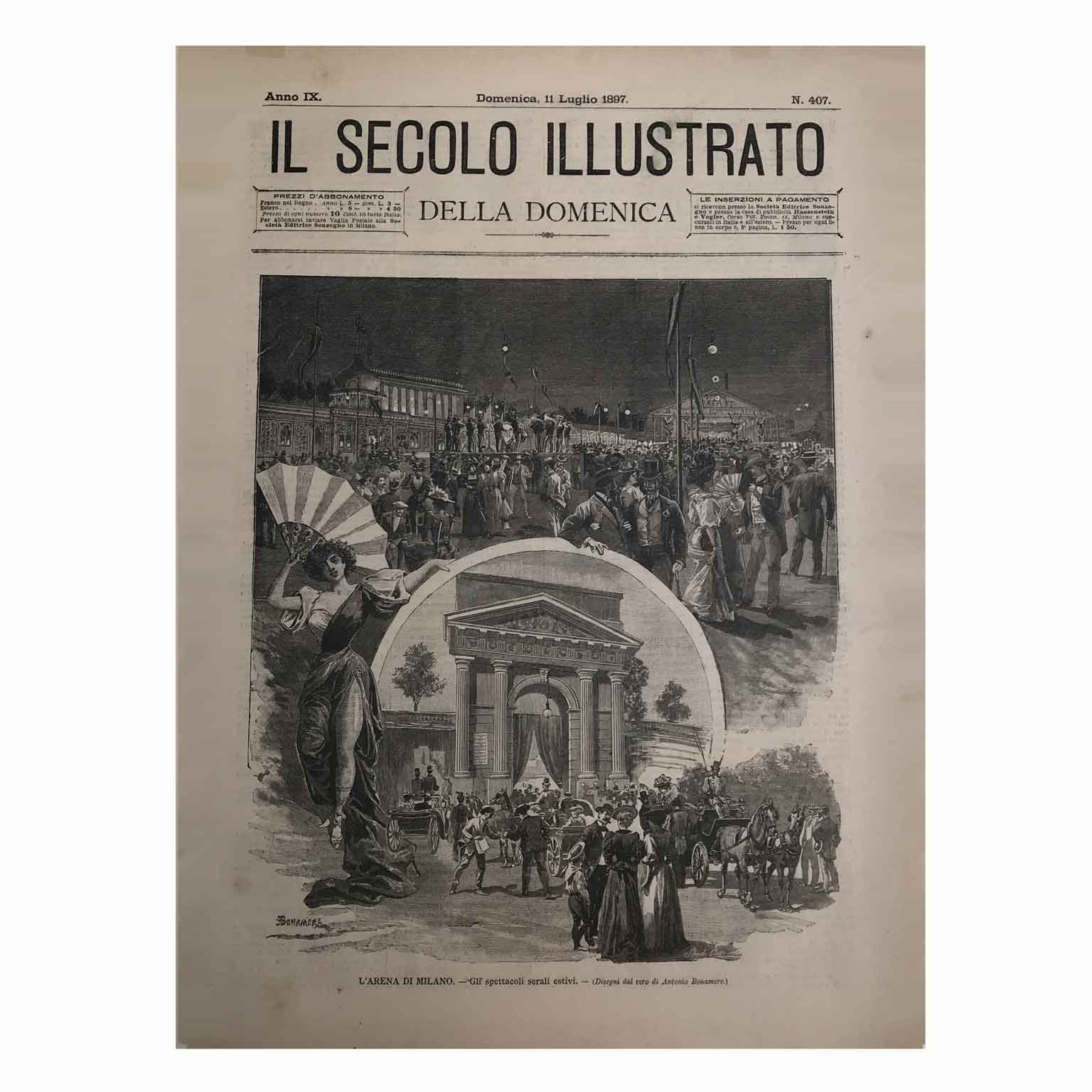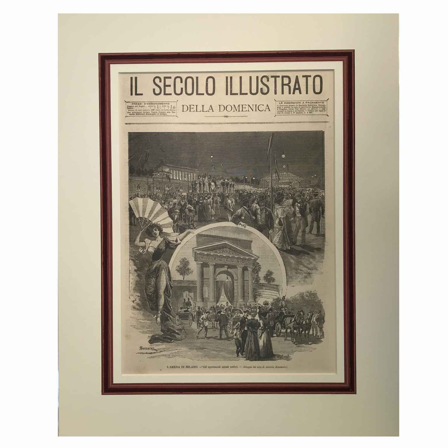Stampa Antica dell’Arena di Milano nel 1897 xilografia disegnata da Antonio Bonamore per il Secolo Illustrato della Domenica, settimanale edito da Sonzogno a partire dal 1889. Sotto la parte illustrata la dicitura “L’Arena di Milano. Gli spettacoli serali estivi”, tratta dal n. 407 del 11 luglio 1897. Si presenta entro passepartout riquadrato da profili acquarellati in buono stato.