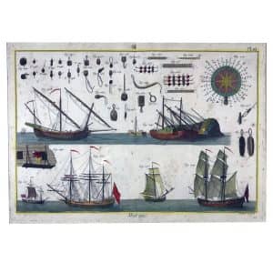 Stampa antica con velieri. Parigi 1760 circa. Incisione con coloritura non coeva con piega centrale raffigurante le differenti imbarcazioni marittime e gli accessori delle varie dotazioni di bordo. In alto a sinistra la rosa dei venti. Nel retro la garanzia di una galleria antiquaria. Questa decorativa stampa navale si presenta entro passe-partout e cornice in radica moderna, è in buono stato di conservazione compatibilmente con la datazione settecentesca.