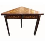 Tavolo angolare in mogano con gambe scanale, intarsiato con motivi floreali; aprendo i due lati del tavolo incernierati tra loro diventa a sezione quadrata si trasforma in un tavolo da gioco. Di provenienza fiamminga, necessita di un consolidamento.