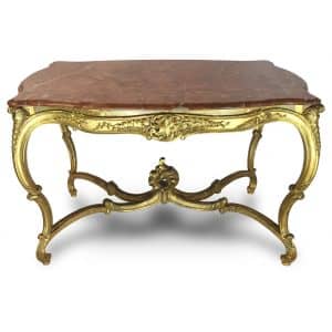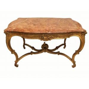 Tavolo da salotto  antico in legno intagliato e dorato con piano rettangolare dal bordo mosso e modanato, in pietra ammonnitica rossa (Rosso Verona).  Si tratta di un elegante tavolo Luigi Filippo da centro che risale all’inizio  Novecento,  riccamente decorato da intagli anche sul retro e sui fianchi; può quindi collocarsi al centro di un locale senza necessariamente essere posizionato a parete.