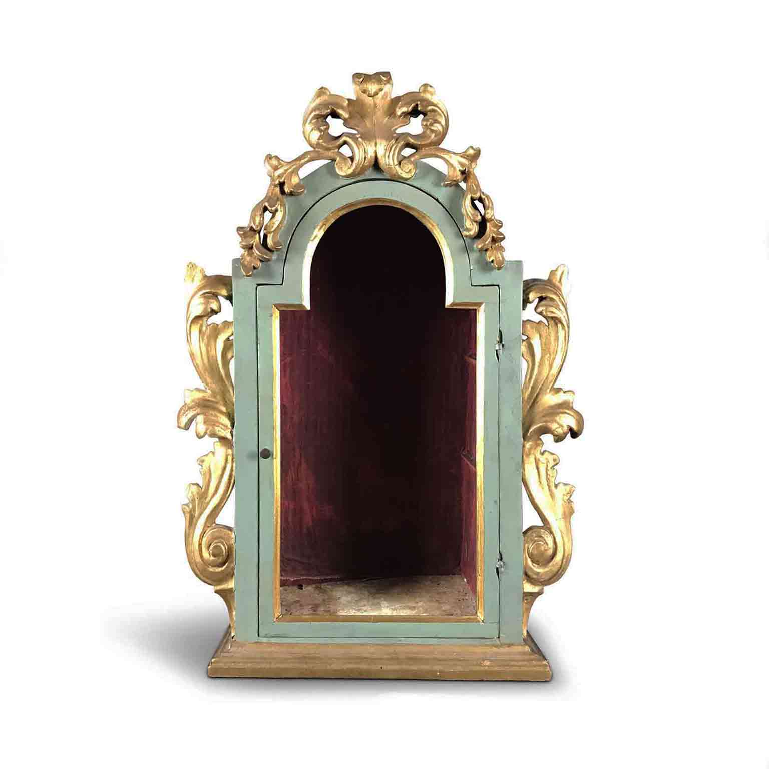 Teca Laccata e Dorata con Anta del 1800 in buono stato di conservazione. Teca sagomata in legno laccato nei toni del verde  e decorato frontalmente con fregi intagliati a motivi vegetali e dorati in foglia.