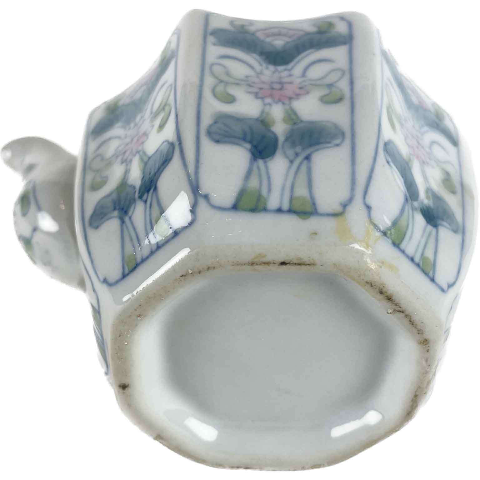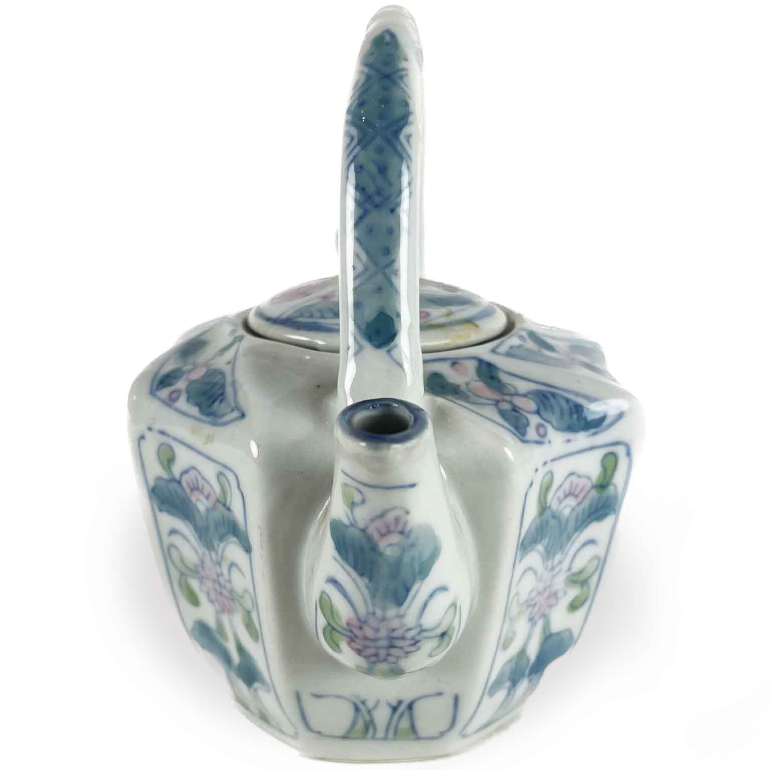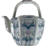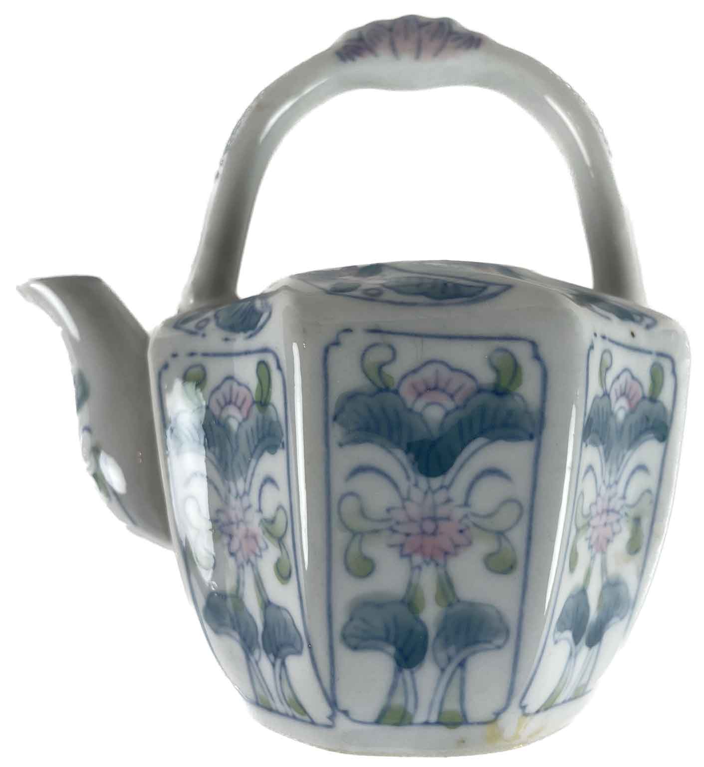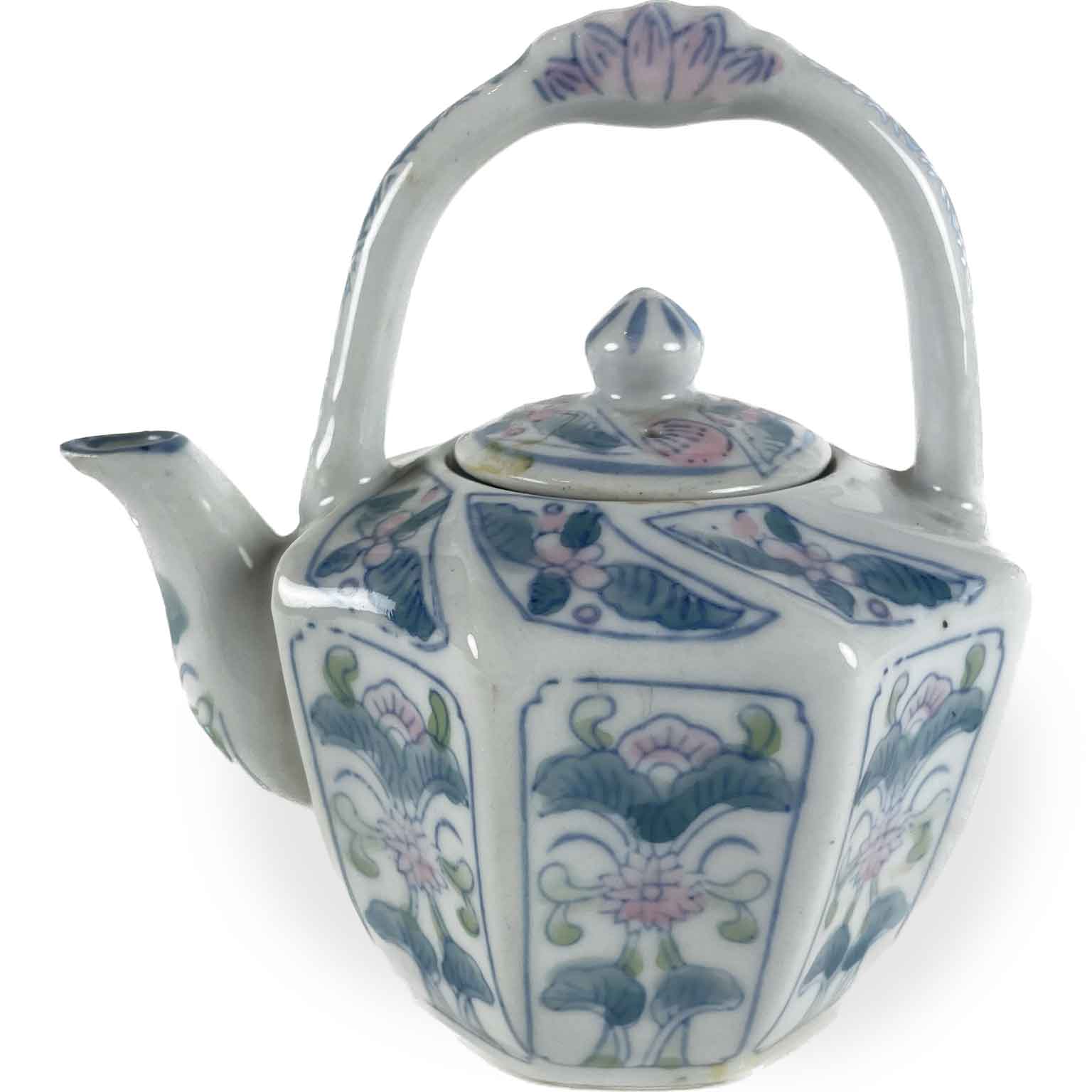 Teiera In Porcellana Bianca E Blu completa di tappo priva di rotture o mancanze. Di forma ottagonale ha una decorazione floreale suddivisa in riquadri su ogni lato della teiera. Le misure contenute fanno pensare al servizio di una singola tazza. Di provenienza cinese risale al 1950 circa.