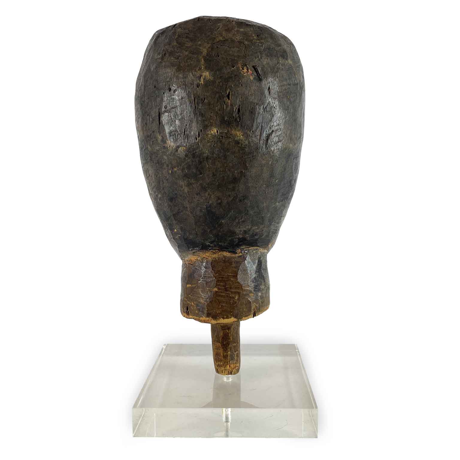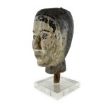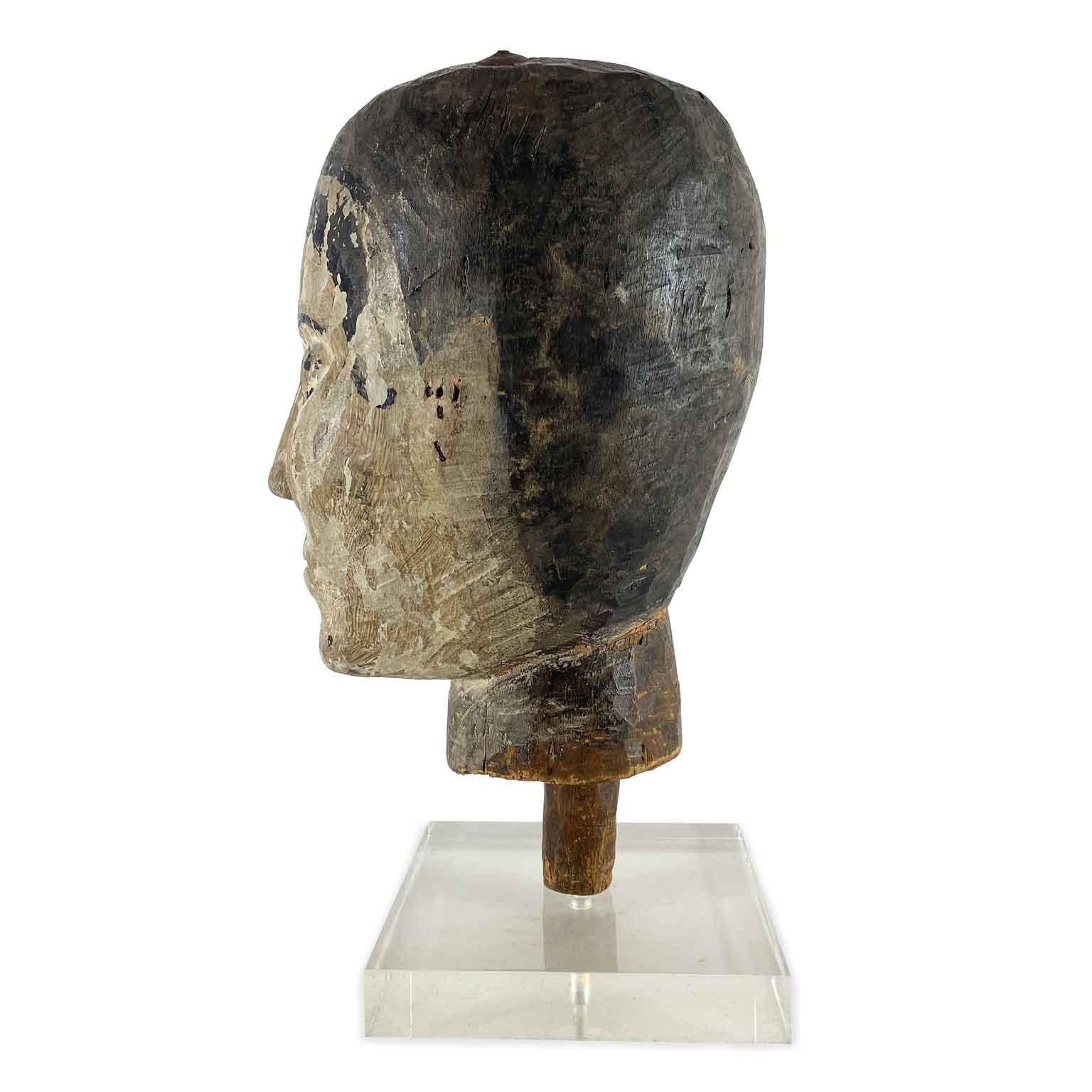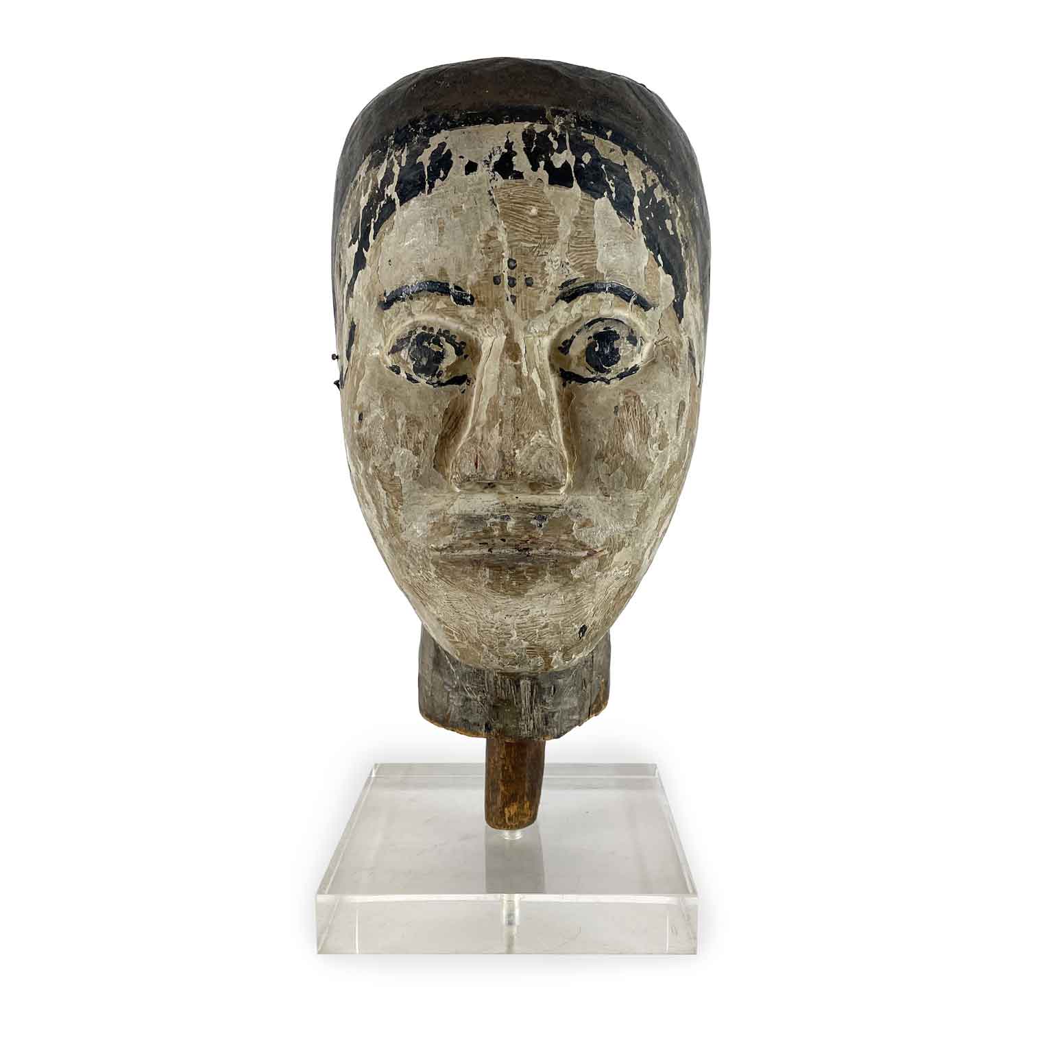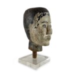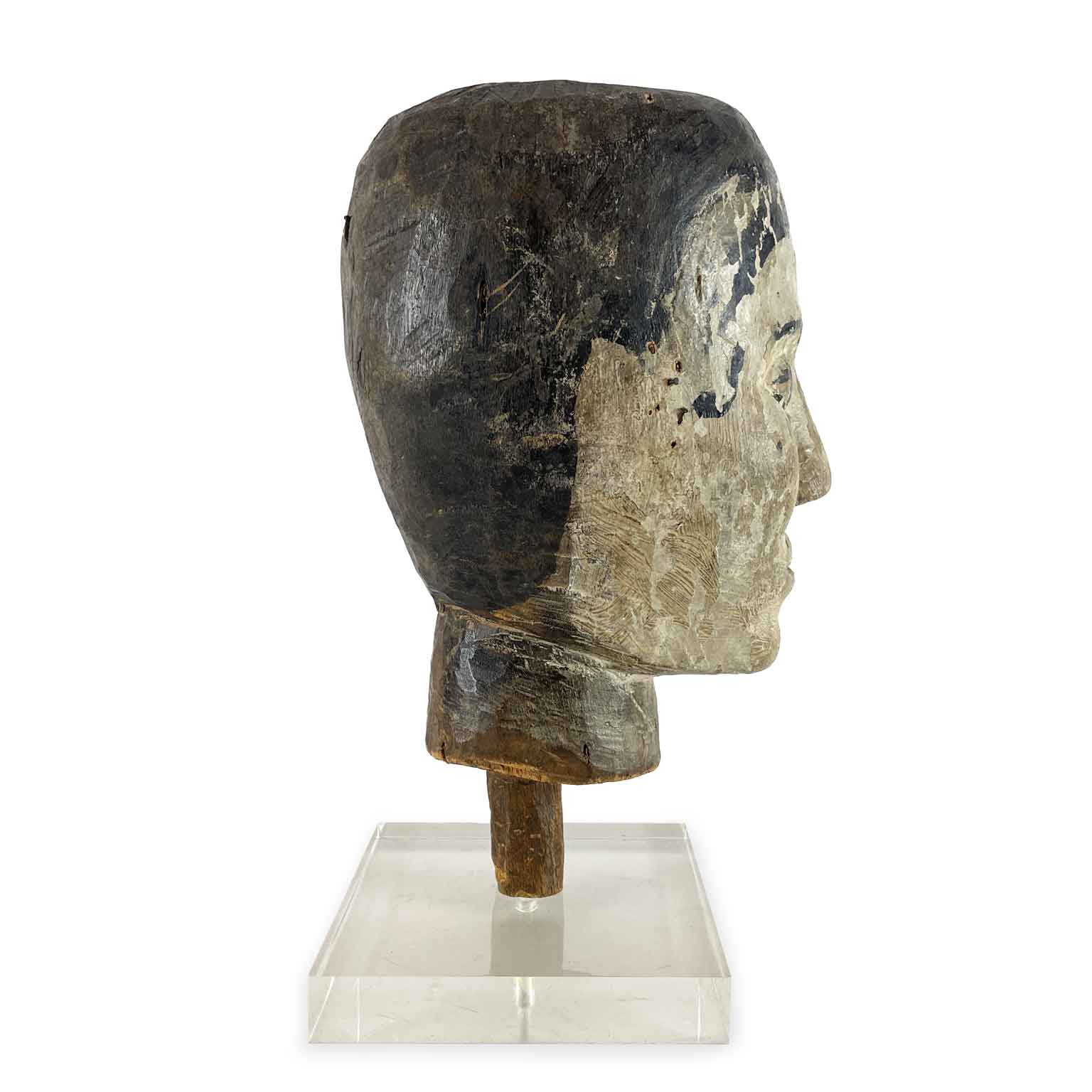Testa Laccata In Legno Scolpito Primi 1900 montata su di una base in plexiglass alta 3 cm. con il collo troncato per l’innesto al corpo per il tramite di una spina. Pur avendo delle cadute di colore diffuse nella laccatura il volto di questa antica scultura ha mantenuto intatta la propria espressività, la propria anima. Le orecchie mancanti probabilmente erano riportate così come si deduce dalle impronte e dai chiodi presenti; gli occhi sono dipinti con linee scure e spesse mentre sulla fronte sono presenti quattro punti scuri, un segno simbolico di natura religiosa e di carattere spirituale. La provenienza di questo volto è vagamente orientale e a nostro avviso risale ai primi decenni del 1900.