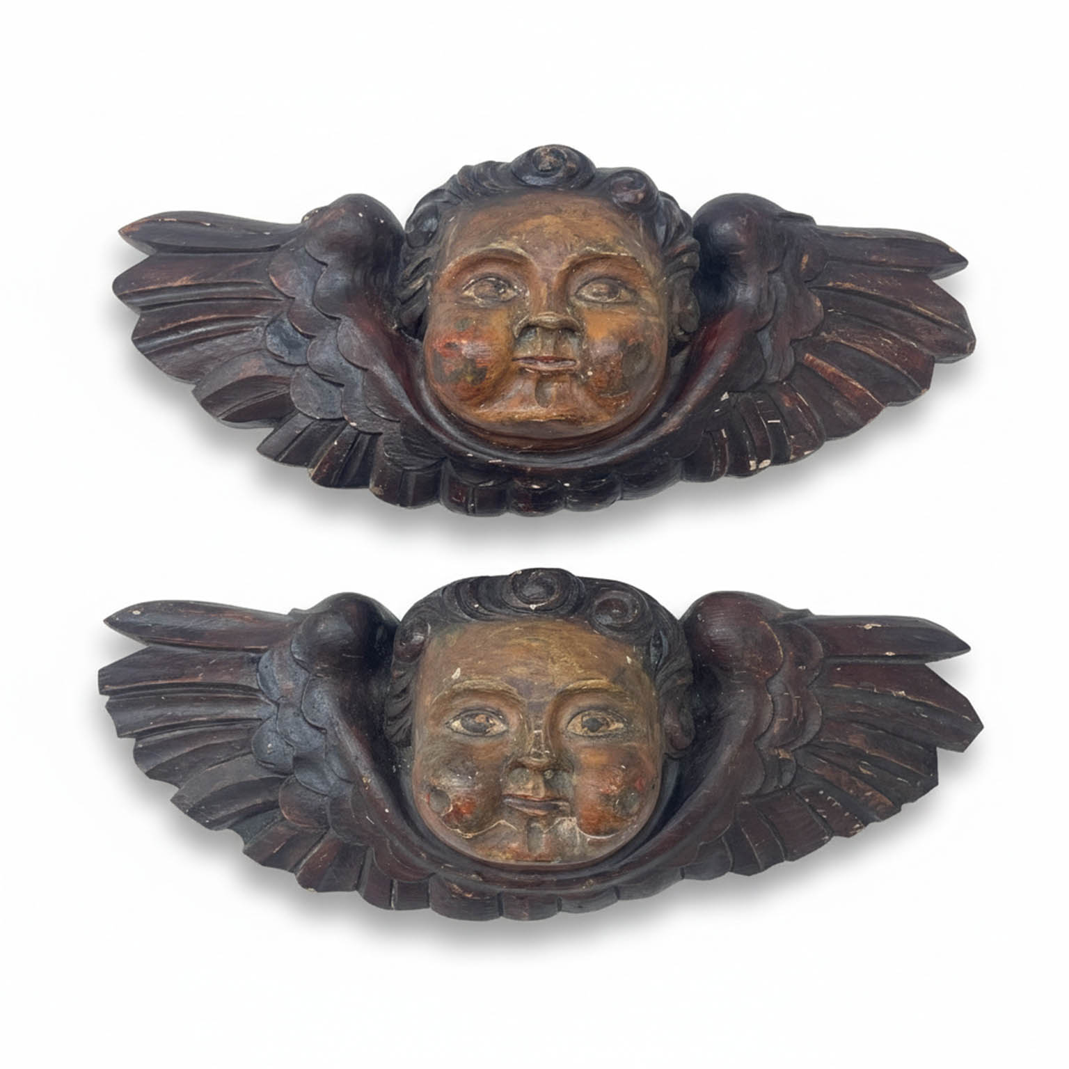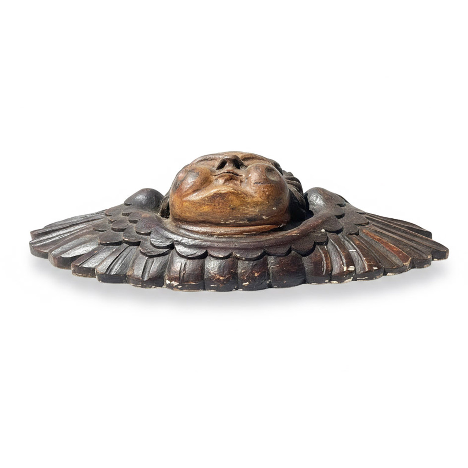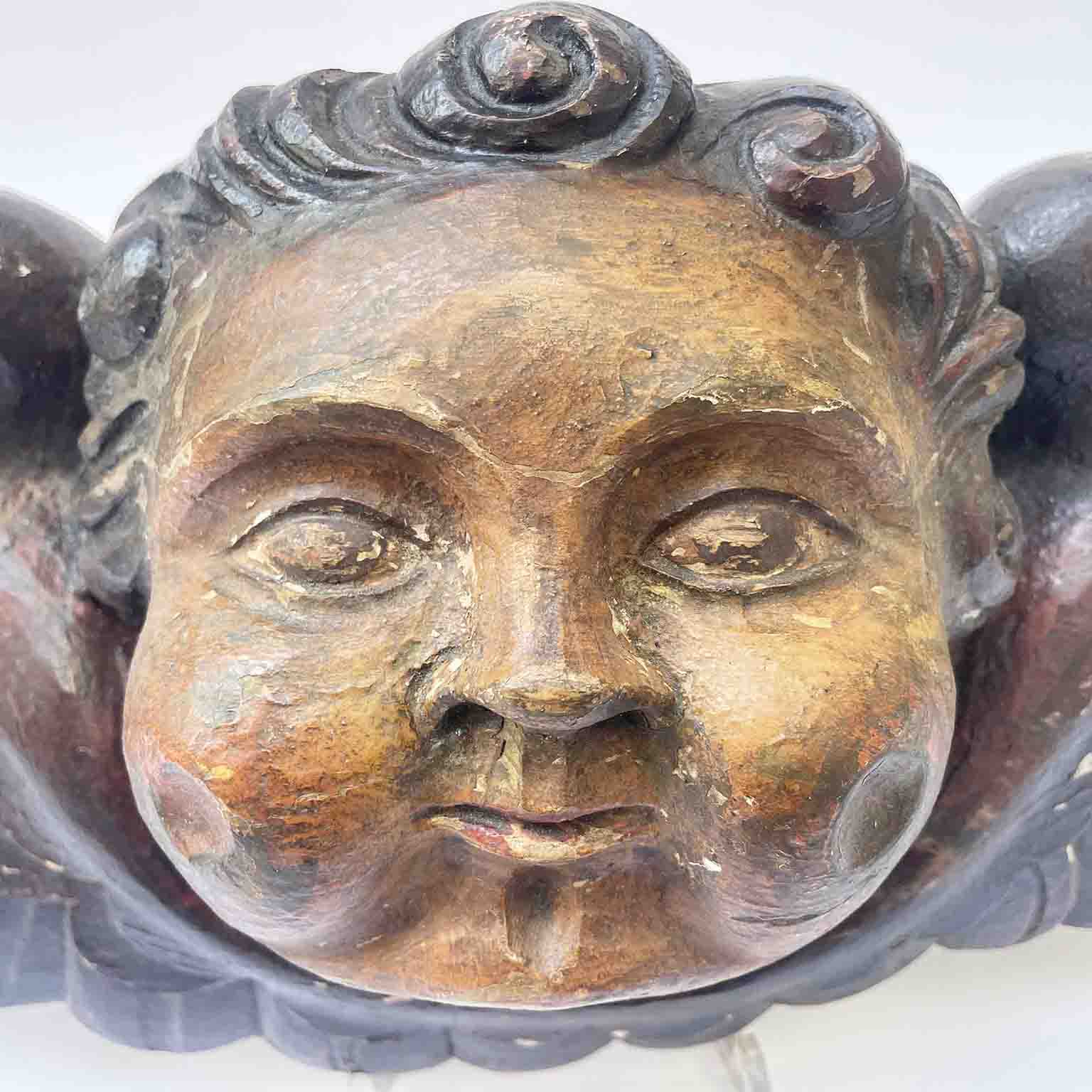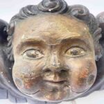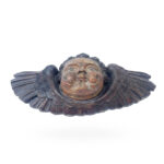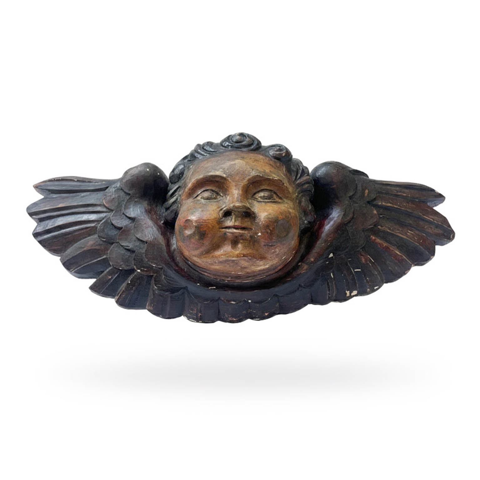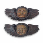 Teste Di Angeli Alate In Legno scolpite in legno di larice e laccate a tempera magra, risalgono al XIX secolo e si presentano in buono stato di conservazione a prescindere da una fessurazione presente in corrispondenza della parte bassa del volto di una delle due teste. Questi due volti di cherubini alati sono antiche decorazioni da muro, pannelli lignei intagliati ideali come sovrapporta, fregi antichi che vengono posti a decorazione dello spazio sovrastante la porta. Questa coppia di fregi antichi presenta minime mancanze e cadute di colore compatibili con la datazione ottocentesca. In considerazione dello scasso circolare nel retro, queste figure di putti alati si presume che fossero utilizzate in origine come basamento di un elemento che veniva innestato in questo scasso. Manufatti italiani della metà 1800.