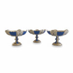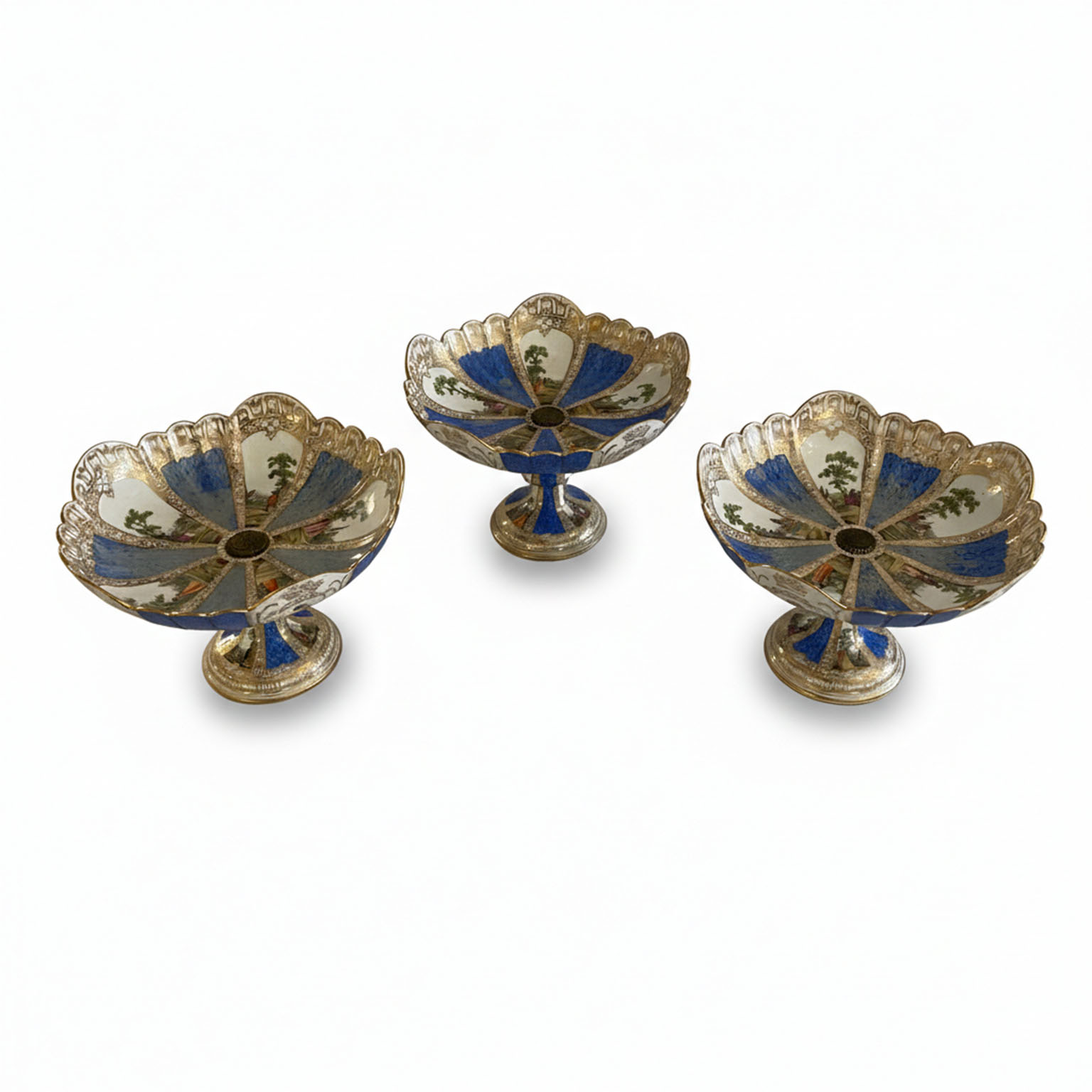 Tre Alzate Portafrutta In Porcellana Policroma e Oro Meissen 1850 in buono stato di conservazione. Questo set di tre alzate è dipinto a mano con fiori, fogliame e racemi in oro su fondo bianco e blu. La coppa è decorata in policromia, è suddivisa in riserve con figure, scene galanti e paesaggi molto dettagliati che si alternano a porzioni dipinte di blu, il tutto è incorniciato da un bordo polilobato e smerlato, decorato con motivi floreali in oro su bianco.