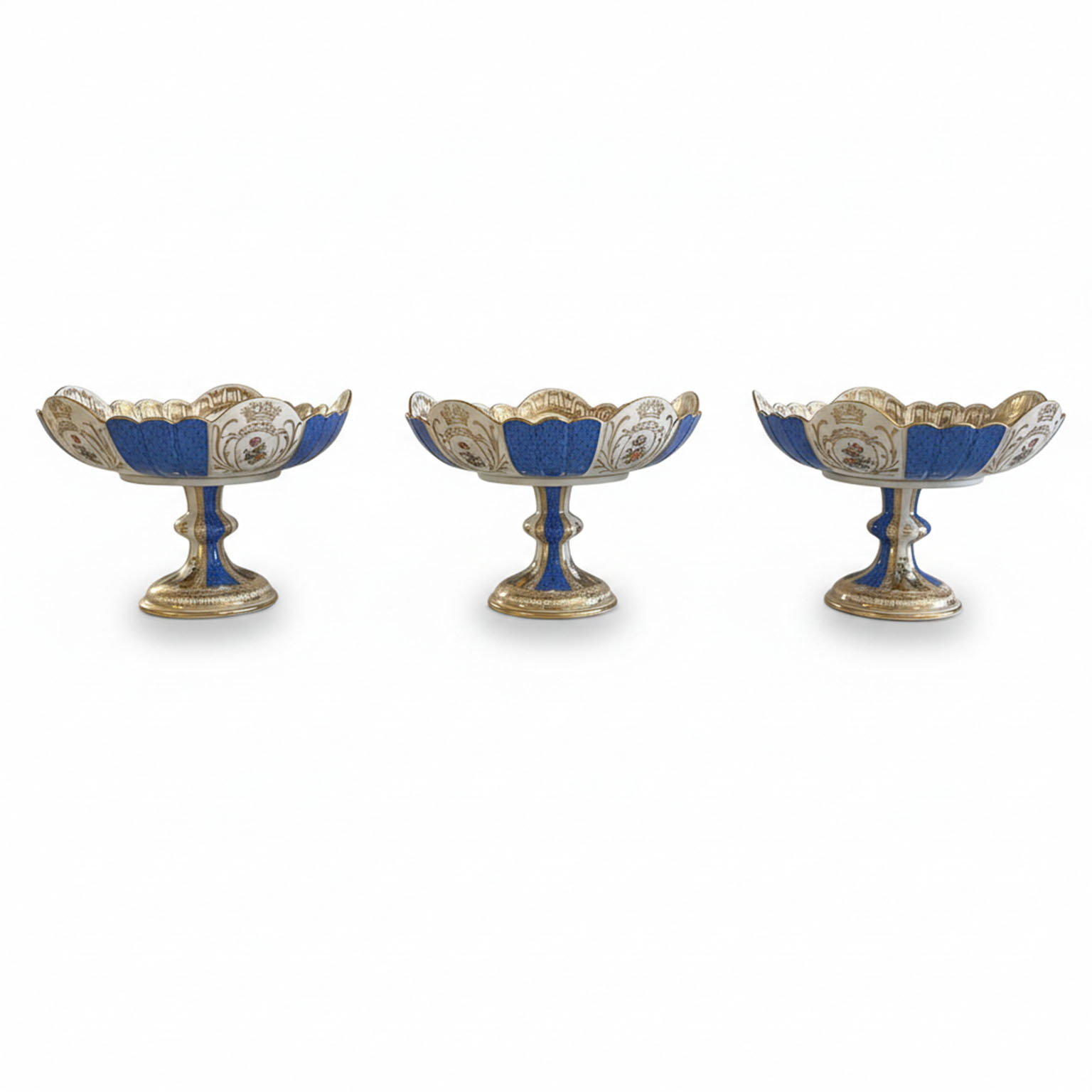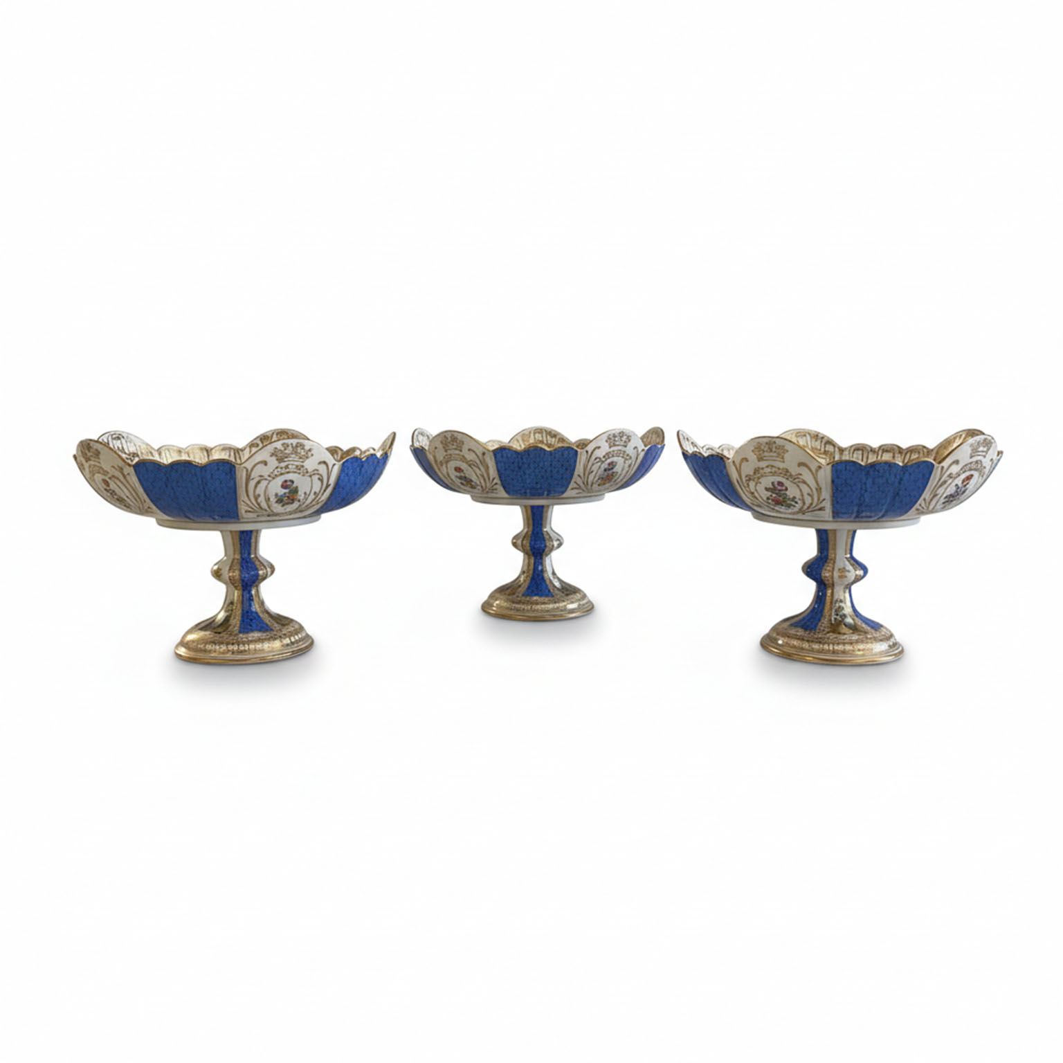 Questo set di tre alzate compote portafrutta o portadolci in porcellana tedesca, reca sul fondo il marchio blu della manifattura Meissen con le due spade incrociate. Provengono da una collezione privata e si presentano in buono stato di conservazione, prive di rotture o restauri, con segni di usura compatibili con la datazione del XIX secolo.