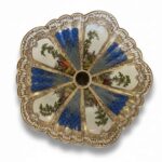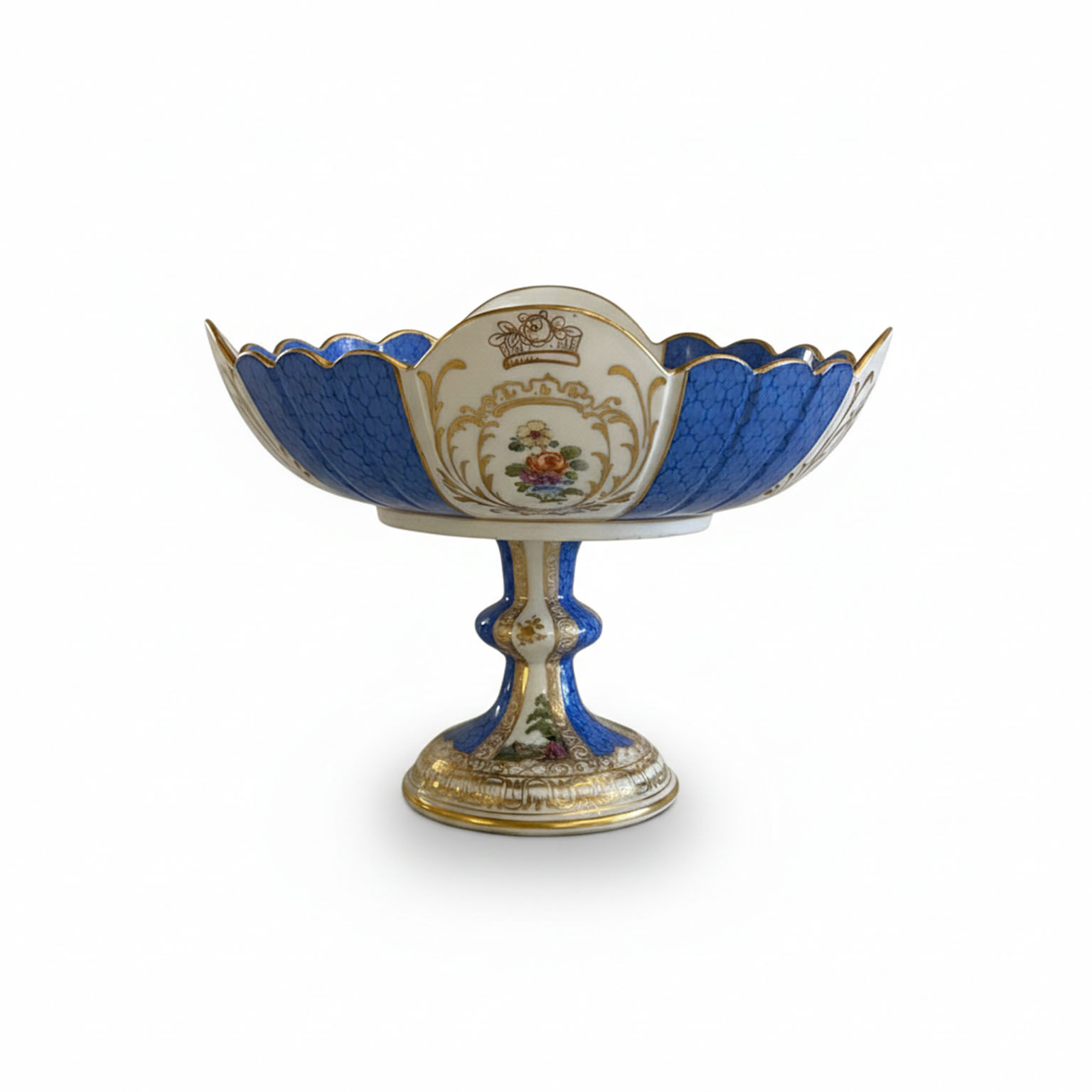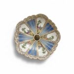 Poggia su un piede circolare che ripropone la stessa decorazione policroma in blu e oro con fiori dipinti in policromia e miniature con figure e paesaggi. La coppa, il piatto di ogni alzata, adibito a contenere frutta o dolci, è sorretto da un piedistallo, fissato al piede tramite un’ anima in ottone filettato.