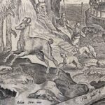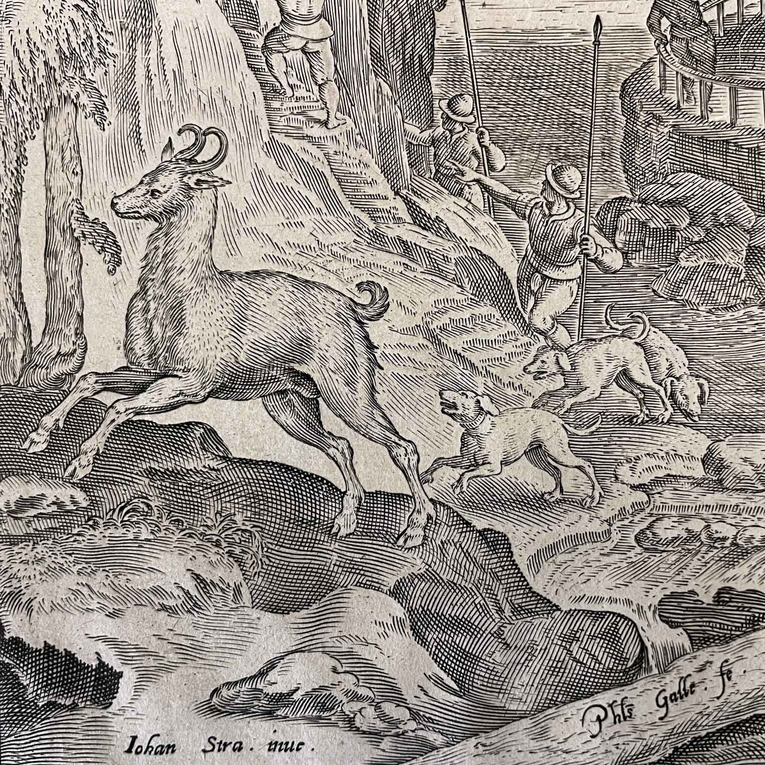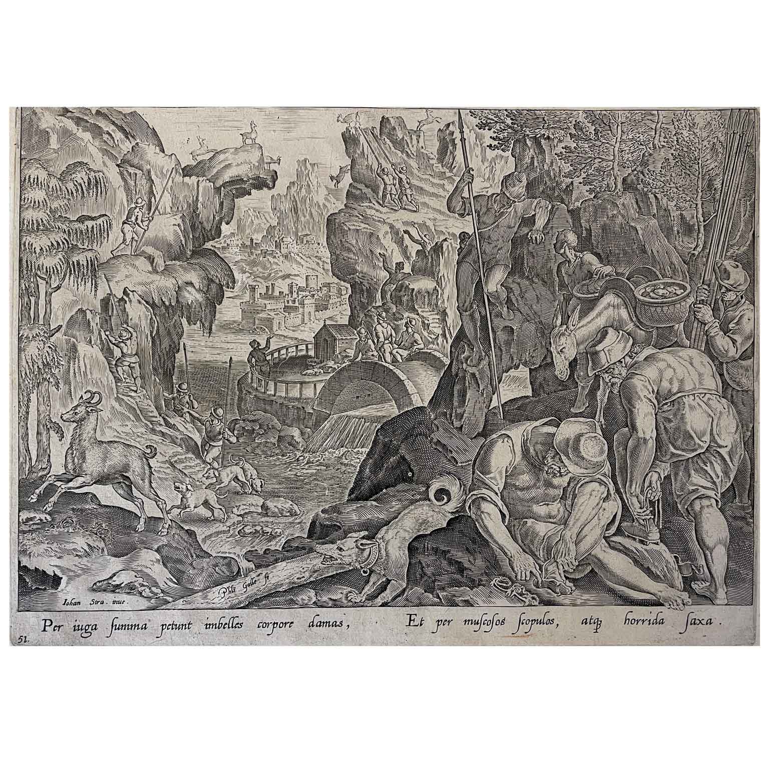 Van der Straet (Detto Stradano) Jan Venationes Ferarum Avium Piscius Caccia Al Camoscio edito da Philipp GALLE (Haarlem 1537 – Antwerp 1612) tratta dall’opera Venationes Ferarum, Avium, Piscium.  Incisione originale a bulino da un soggetto di Jan van der Straet nato a Bruges nel 1523 e morto a Firenze nel 1605, italianizzato e conosciuto con il nome di Giovanni Stradano,  disegno preparatorio con soggetto venatorio per gli arazzi della villa di Cosimo de’ Medici a Poggio a Caiano.