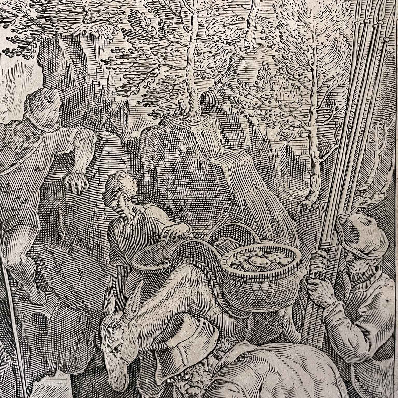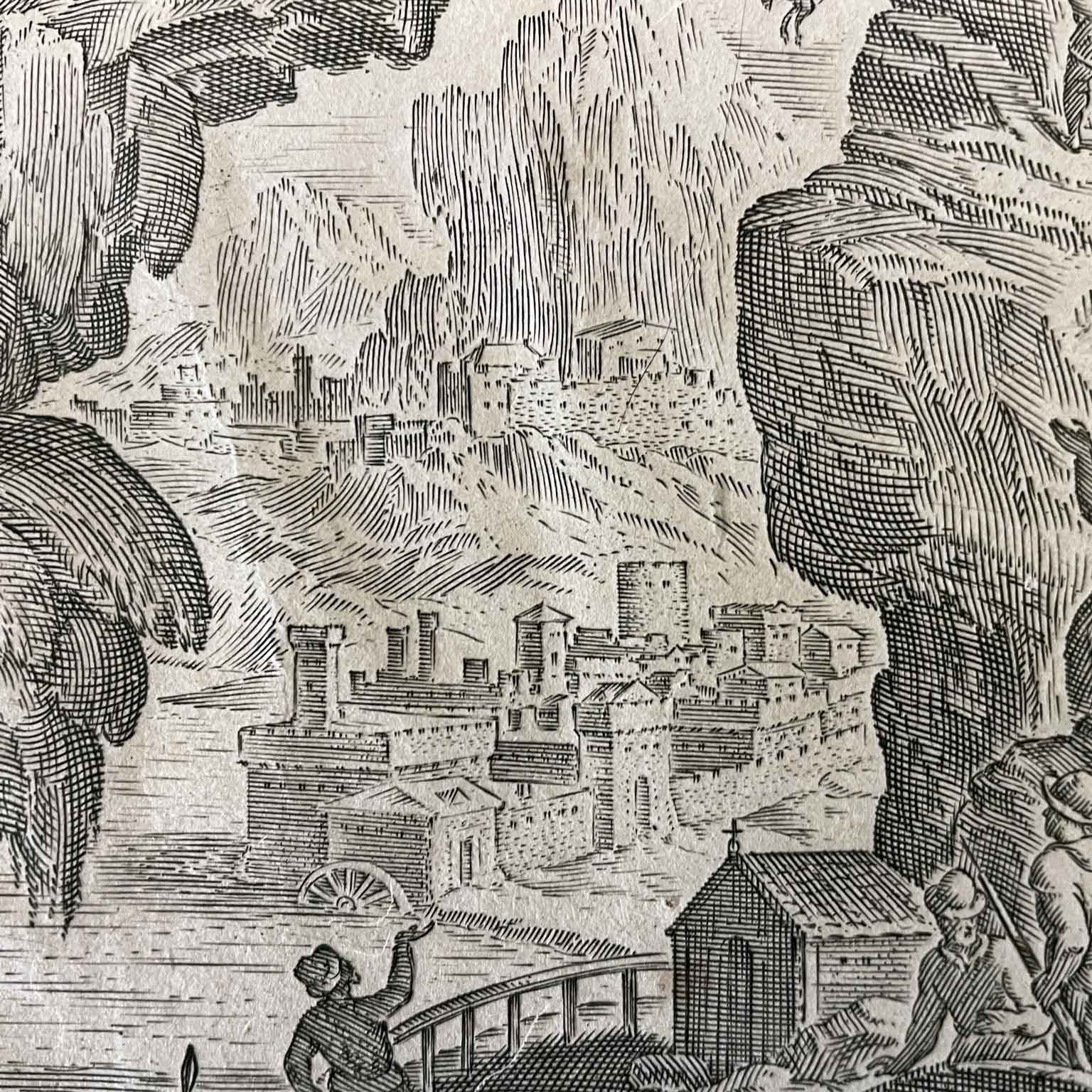 Stampato su di una porzione di sottile carta vergata recante filigrana secondo la tipica produzione cartaria nordeuropea della prima  metà del XVII secolo, completo dell’impronta della lastra e con margini di diverse dimensioni variabili dal centimetro ai due centimetri, con vari piccoli difetti ai bordi ma nel complesso in buono stato di conservazione.Tavola ricca di personaggi in azione e circondati da sfondi bucolici, uomini, animali, fantasia e realtà allo stesso tempo.Didascalia in latino nella parte inferiore.