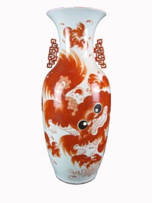 Grande vaso cinese in porcellana bianca dell’Ottocento,  decorato con un  cane di Pho dipinto in rosso così come nei manici traforati a decoro geometrico. Di provenienza cinese, risale al XIX secolo e si  presenta in perfetto stato di conservazione.  E’ alto 60 cm e sul retro vi sono delle iscrizioni in nero.