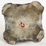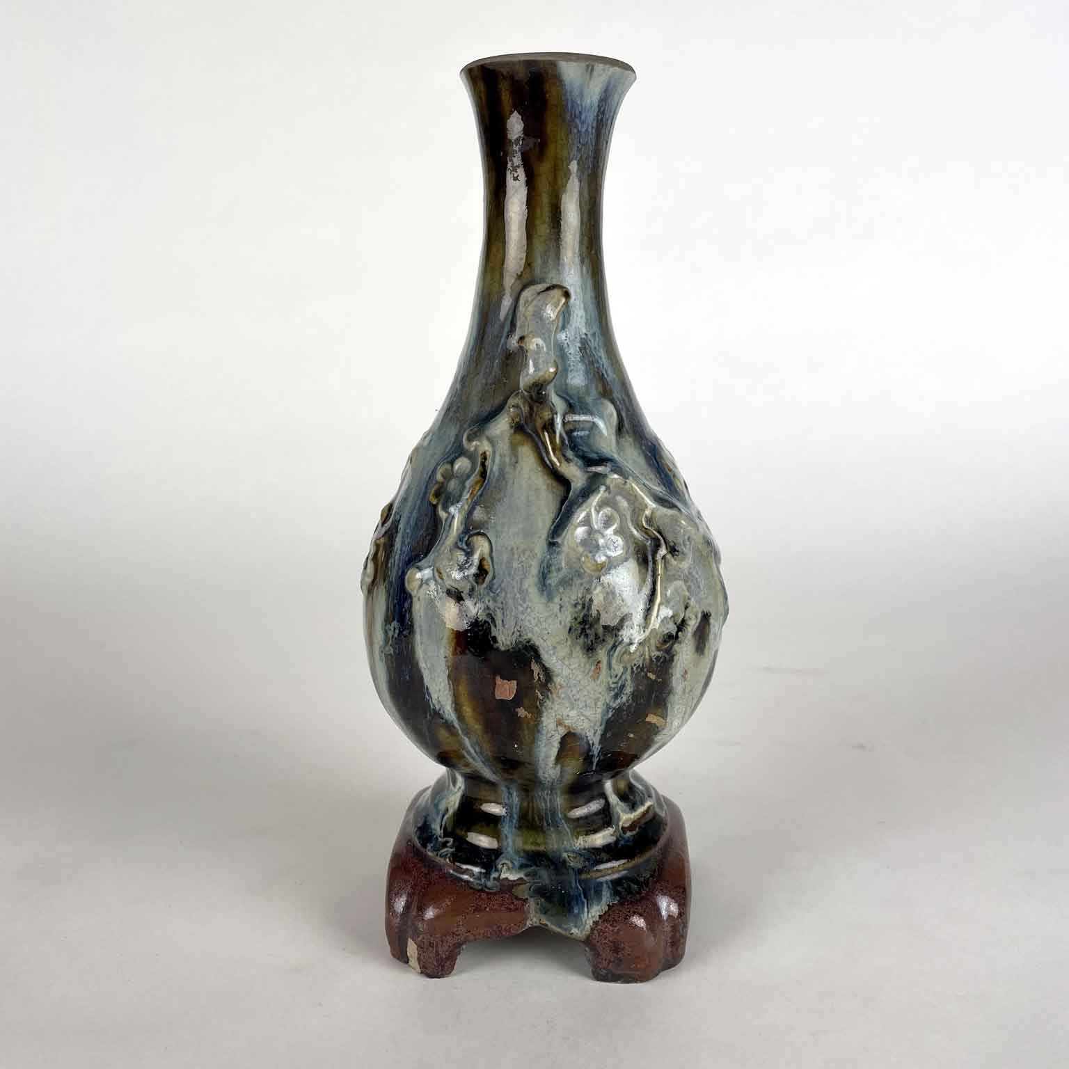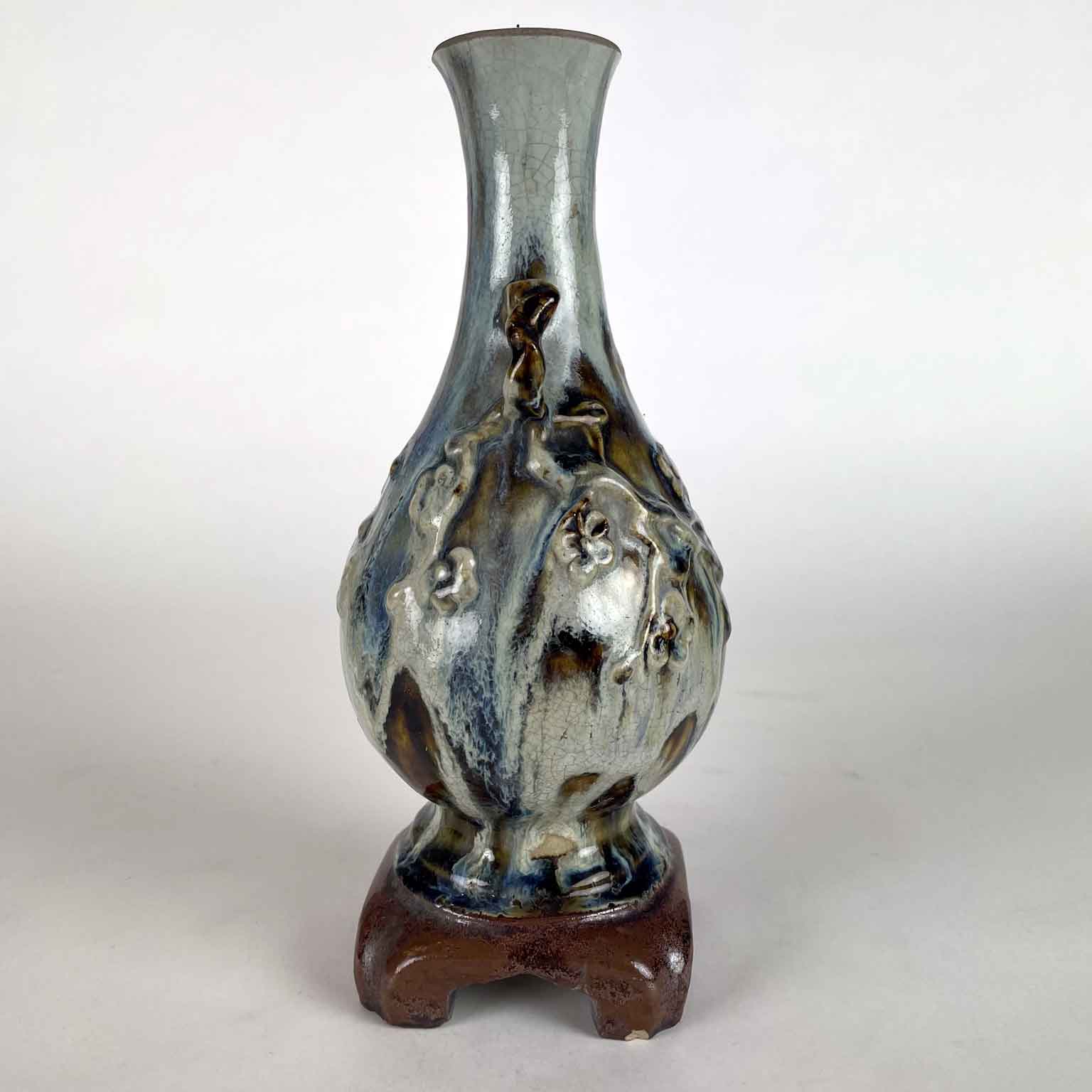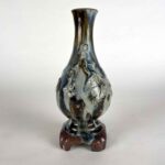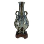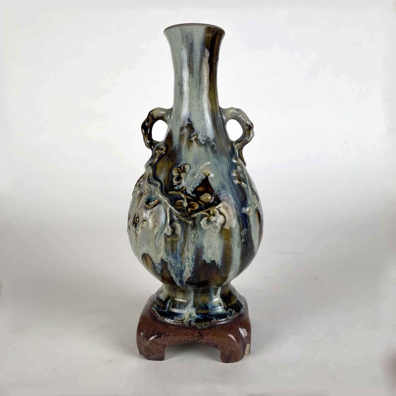 Vaso Cinese In Porcellana Primi 1900 a forma di bottiglia con manici laterali e con una base quadrata color mattone scure. Sul corpo partendo dai manici ci sono dei ramages di fiori in rilievo; tutto il vaso è colorato dalla colatura di colori verdi e bruni. Sotto la base un marchio tondo color rosso. In ottimo stato.