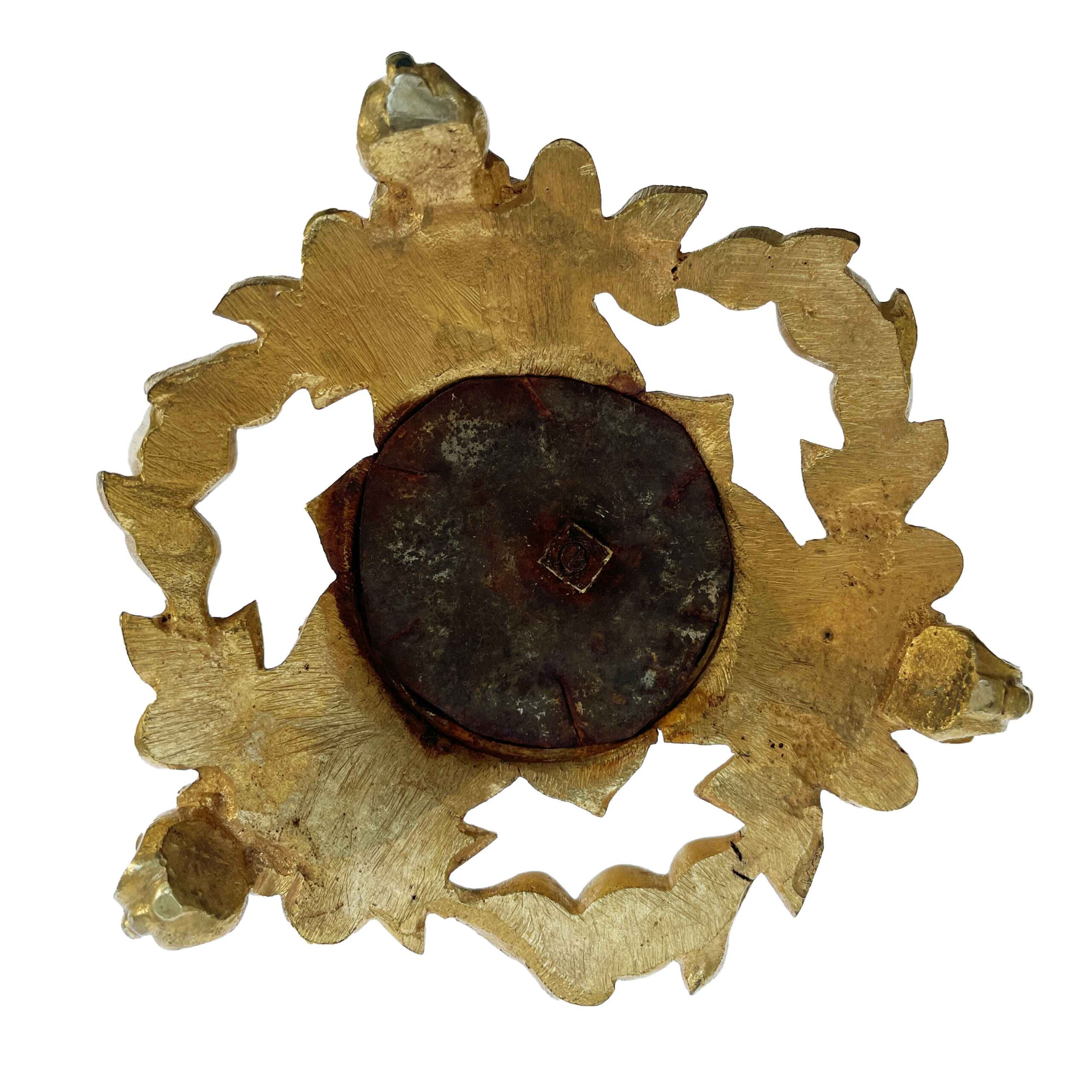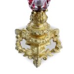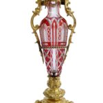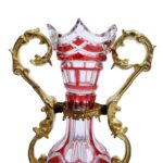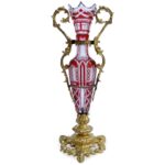 Una bella base tripode con raccordi circolari  e decorazioni floreali e geometriche imposta con dei rocchetti il vaso in cristallo trasparente con inserti color rubino. Dei manici con teste di delfino e racemi sono applicati al vaso tramite una ghiera circolare perlinata inferiore ed una guarnizione superiore bloccata da due viti. La doratura a fuoco è in buone condizioni a prescindere da minime sdorature sulle parti in rilievo della base nella quale si segnala una pregevole finitura a cesello. Una minima sbeccatura sull’apice di un festone del cristallo nella parte superiore. Di provenienza italiana.