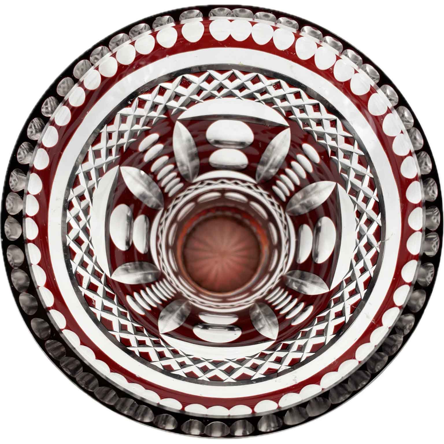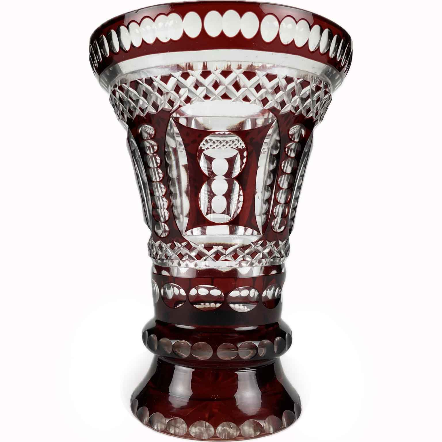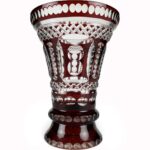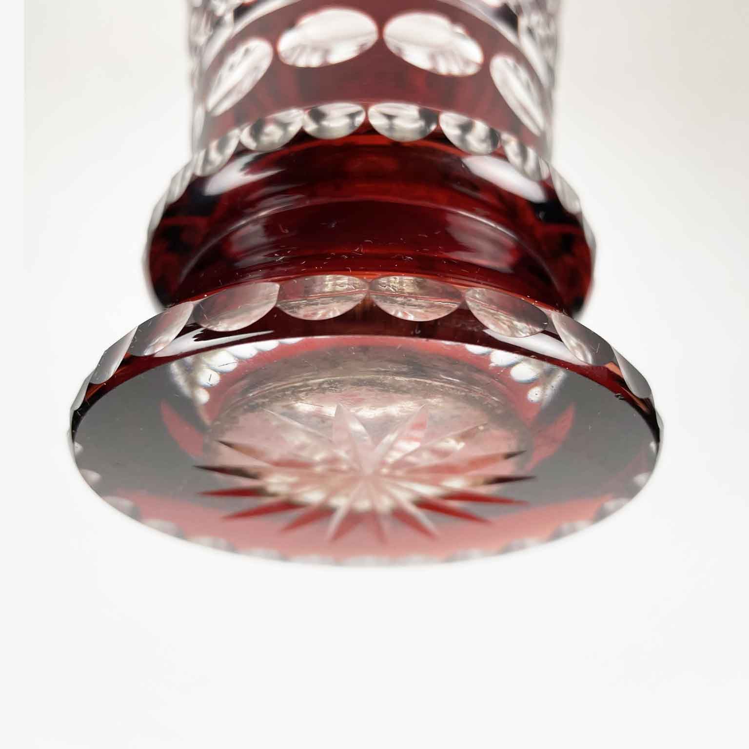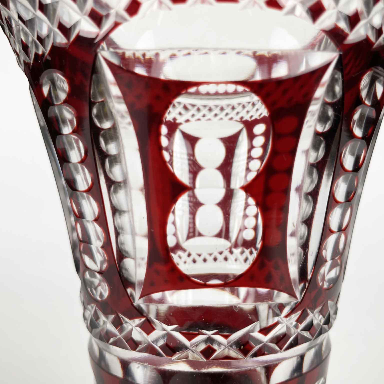 Vaso Da Fiori In Cristallo Di Bohemia a forma di tromba con la superficie esterna color rosso rubino e le parti intagliate trasparenti; questo contrasto unitamente alla densità degli intagli conferisce una particolare ,luminosità al vaso. Risale al 1950 e proviene dalla Bohemia. In buono stato di conservazione, privo di segni o di sbeccature.