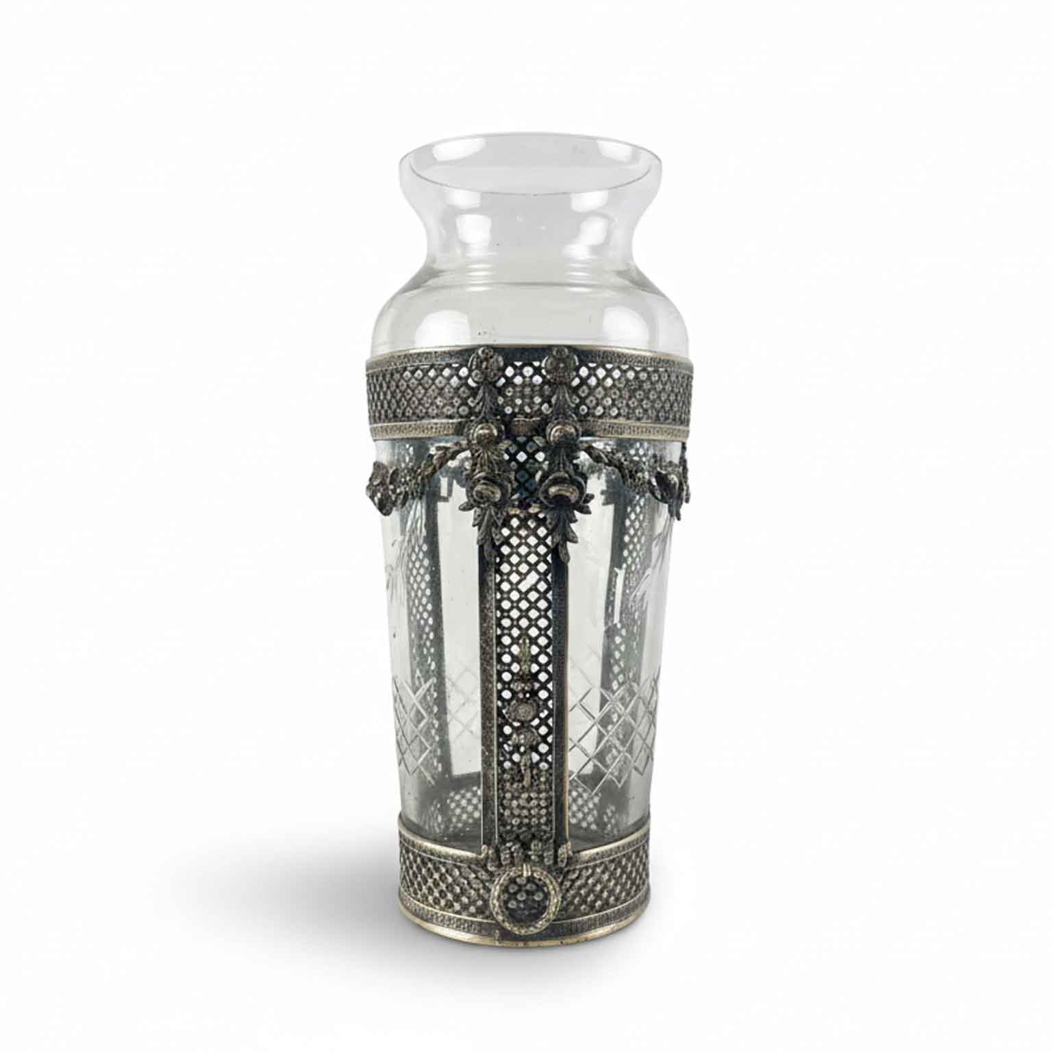 Vaso Da Fiori In Cristallo Molato Con Decorazioni In Metallo Argentato 1920 Circa in ottimo stato di conservazione, prico di sbeccature o filature. Il vaso ha delle molature geometriche incrociate alla base nella parte bassa e delle ghirlande di foglie e fiori nella parte alta ed è decorato a sua volta da dei nastri traforati e sbalzati con ghirlande di alloro e festoni di fiori e frutta. Di provenienza italiana dei primi decenni del 1900.