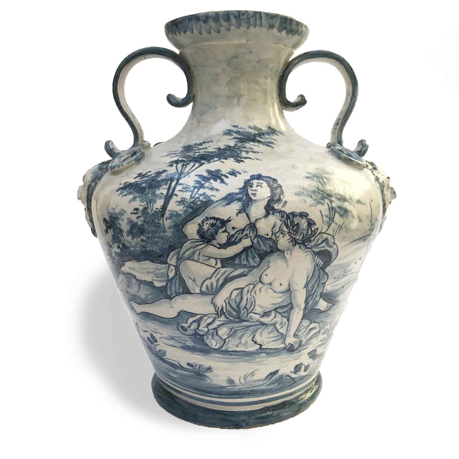 Vaso in Maiolica Savona con la forma di un’anfora schiacciata e due mascheroni laterali con due manici sovrastanti. Sul fronte il decoro di una scena bucolica con figure in primo piano mentre sule retro una decorazione floreale unitamente a segni di fantasia contornano la data del 1711 ed un monogramma non decifrabile. Tutto il vaso è decorato in blu su fondo bianco e non riporta marchi che possano far risalire alla sua provenienza che, per analogia con altri lavori similari, si presume savonese. E’ in perfetto stato di conservazione e contrariamente a quanto scritto, risale alla metà del 1800.