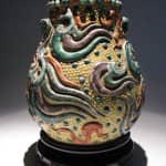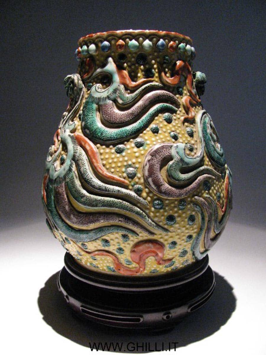 Vaso circolare in porcellana dura, a fondo giallo con decori in rilevo policromi. La decorazione di questo vaso è davvero unica e inusuale, originale sia nei motivi fantastici che nella perlinatura del bordo superiore.